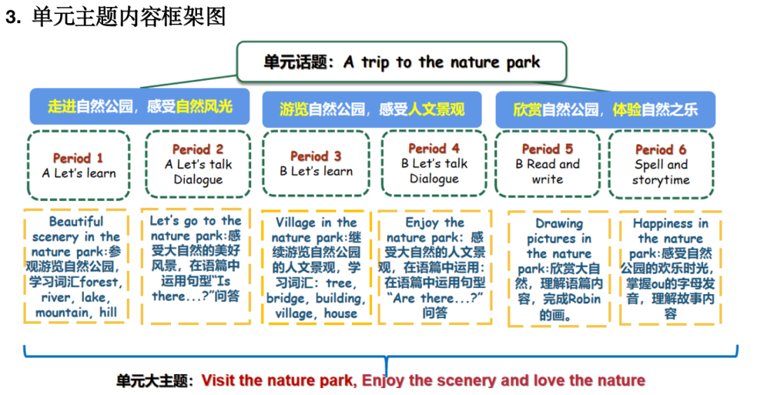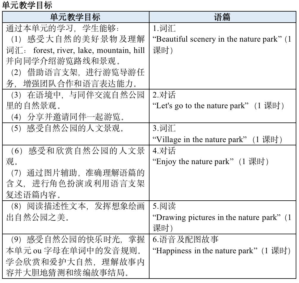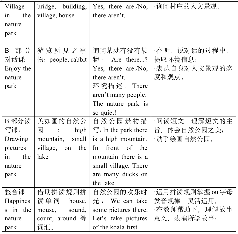 本单元的学习主题是自然公园,以单元话题“A trip to the nature park”为导向,带领学生欣赏自然界的优美的景观,感受自然公园里的人文景观,体会人与自然共存的理念,接着描绘自然界中的美好景象,分享在自然界中发生的趣事,引导学生亲近自然、热爱自然,并能了解一些保护环境的常识。 根据单元学习主题和单元话题为指导,本单元包含六个语篇: 语篇一是A部分词汇课。教材通过John和Chen Jie谈论自然公园地图的情景呈现了单词的词性和意义。通过学习,学生能了解到自然公园中有森林、湖泊、高山、小山丘和河流。体现亲近自然,热爱自然风光。 语篇二是A部分的对话课。教材通过Miss White带领学生去自然公园游玩的情景展开,并在游玩中观察和欣赏美好的风景。通过孩子们与Miss White的对话学习Is there...? Yes, there is./No, there isn’t.询问并回答某处是否有某物。引导学生与自然和谐相处,进行亲近自然的活动。 语篇三是B部分的词汇课。教材通过Miss White和学生来到自然公园的自然村落,了解村庄里有房子、树木、建筑和桥,学会观察村落的分布,引导学生爱护我们的美好家园。 语篇四是B部分的对话课。教材通过Miss White和学生来到自然公园的湖边休憩和观察,感受自然公园的人文景观,了解自然公园的宁静和美好,通过学生与Miss White的对话学习Are there...? Yes, there are./No, there aren’t.询问并回答某处是否有某物。以及感受自然界中动物的和谐相处。引导学生爱护我们的美好家园。 语篇五是B部分的读写课。教材语篇与上一单元Mr Jones写给Robin的邮件紧密相连,Robin帮Mr Jones收拾完房子之后被窗外的优美景色所吸引,房子附近就是一个自然公园,公园里面有高山,山的前面是一小村庄,村庄附近有一条河流穿过,湖里还有许多小鸭子。Robin决定把如此景色画下来。学生通过阅读完成Robin的绘画,并运用所学描述美丽的画面,引导学生学会欣赏美景,记录美景,爱护自然。 语篇六是语音和故事课的整合课。描述Miss White带领学生们在自然公园的快乐游玩,学生通过语篇阅读感知ou的字母发音规律,通过一定的游戏和活动强化感知。并引出Zoom和Zip和孩子们分享自己的游玩拍照经历。学生通过趣味故事,再次感受到大自然美好的风光,同时也鼓励大胆猜测故事结局和表达观点。