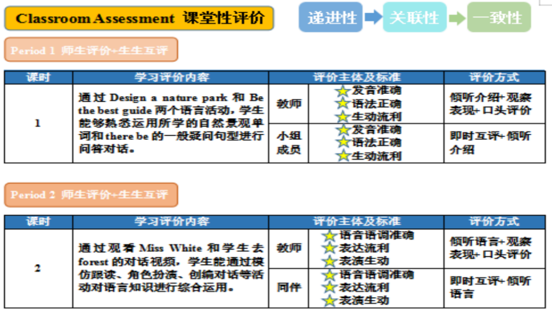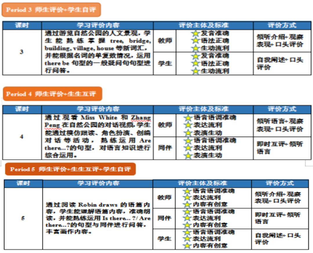 依据教学目标确定评价内容和评价标准,通过组织和引导学生完成以评价目标为导向的多种评价活动,以此监控学生的学习过程,检测教与学的效果,实现以评促学,以评促教。针对本单元的教学,单元教学评价由以下三部分组成:课堂性评价、作业评价和单元评价。通过这样的教学评价设计,实现评价主体多元化,评价内容多维化,评价方式多样化。
