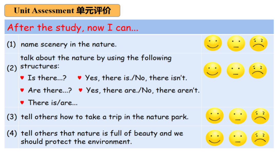 5.立足于单元整体进行教学设计。虽然本节课的重点句型是“Is there...?” “Yes, there is./No, there isn’t.”但教师结合本单元B部分”Are there...?” “Yes, there are./No, there aren’t.”的复数句型进行教学,因为新单词的单复数形式本就是教学重点,所以让学生提前结合复数句型进行学习,有利于构建学生对名词单复数的整体认知,为下一部分的学习进行更好的铺垫。 当然,本节课也有需要教师反思和改进的地方,比如,老师和学生在课堂上要注意语言知识的交流,像这节课中呈现一段流水的声音,老师如果直接说这是“the sound of a river”,这很明显是为了教“river”这个单词而设计的,就显得生搬硬套了,教师可以用“I think...”鼓励学生去发散自己的思维来表达自己的看法,最后教师再引出“river”这个单词,就可以巧妙地化解这个问题。另外,在孩子们进行小组活动过后,教师应该先给一点时间给他们互相分享,然后再邀请学生上台展示,这样对话呈现的效果会更好,孩子们也会更有自信、更加积极。课件下载