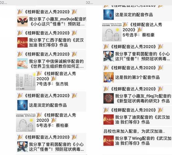 结合问卷星与一起作业网的系统错题分析,利用线上教学、现代科技手段更能系统、准确地为课后制定“评讲小视频”针对性错题训练。 线上学习之余,桂畔英语科组老师们针对非常时期线上教学的特点,结合英语+科学整合教学,组织开展了一项特殊英语配音的活动——为武汉加油“桂畔配音达人秀2020”。学生可以在“英语趣配音”等网站寻找关于冠状病毒的视频进行配音活动。同学们在收到邀请后,各显神通,制作完成了妙趣横生的“原声”作品。内容丰富的视频配音,既锻炼了同学们的语言能力,开拓了同学们的视野,又以其科普性、趣味性激发了同学们学习的热情,培养了学生的爱国情怀和人文素养。