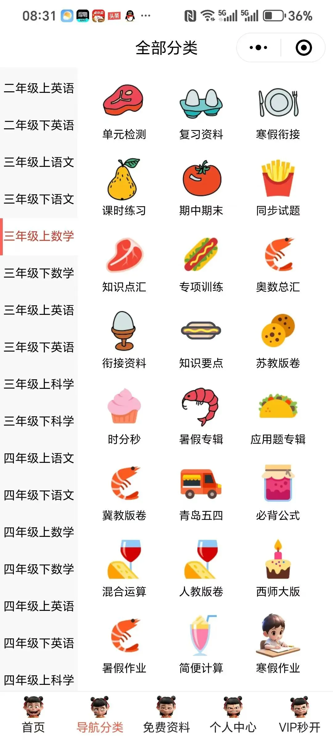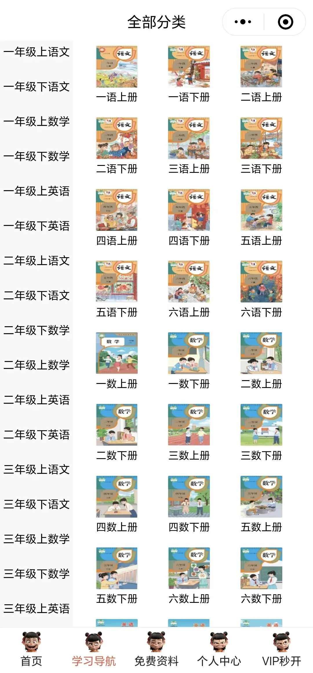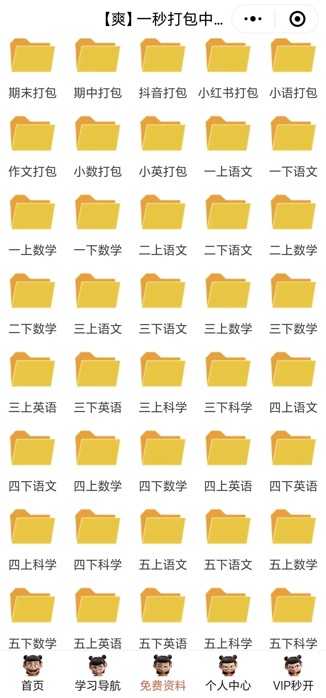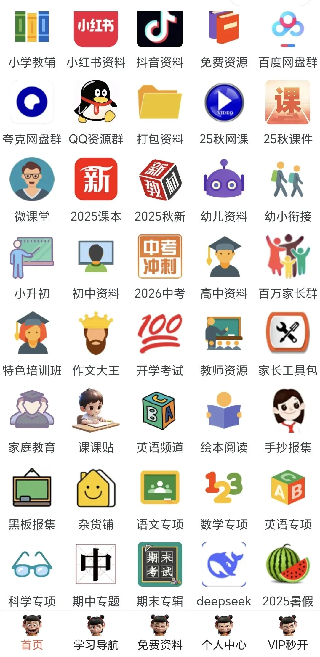 还在为孩子的学习资料东奔西找?这个宝藏学习工具直接帮你把小学全学段的语文、数学、英语、科学资料一网打尽! 从幼小衔接到中考冲刺,从电子课本、同步练习到期中期末试卷,从作文素材到奥数专项,甚至还有手抄报集、绘本阅读这类拓展资源,分类清晰到一年级上册语文的拼音资料、三年级下册数学的面积易错题型都能精准找到。 更贴心的是,资料按学期、版本分门别类,人教版、北师大版、苏教版等各地教材配套资源一应俱全,打包资料一键获取,VIP还能解锁更多精品内容。不管是家长辅导作业,还是老师备课,都能省出大把时间,简直是小学学习的“资源百宝箱”!