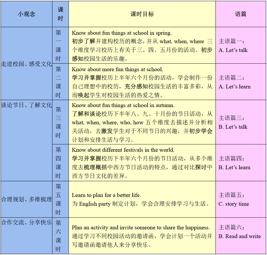 学生基于对单元主题school calendar 下6 个主语篇的学习,构建对school life 的认知、态度和行为选择。这6 个语篇包含对话、描述性文本、邀请函等,每个语篇承载一个小主题,每个课时承担单元目标的一部分或者一个阶段,每课时不是一个孤立的存在,同时课时与课时之间也有着紧密的关联,这节课承接上节课的部分内容,同时为下节课奠定基础。 本单元的授课对象是五年级的学生,年龄在11 岁上下,已学习英语五年。学生活泼富有激情、善于表达,对英语学习的兴趣浓厚。 学生具有较强的口语表达能力,有用英语思维的习惯,已经掌握一定的阅读策略,有小组合作学习的习惯。他们具备一定的分析和概括能力,能在教师的引导下,进行英语阅读和写作。 学生已经学习了关于星期、季节、活动的词汇(spring, summer, autumn, winter, go on a picnic, pick apples…),并能使用以下语句谈论季节活动以及表达自己的喜好等。Which season do you like best? What do you do in..? Why? There are…I often…. 学生都熟悉日历,都体验过学校开展的校园活动以及一些节日的庆祝活动(eg. 儿童节、教师节等)。部分学生有参加或举行聚会(eg. Birthday party)的经历。(1)学习梳理12 个月份的英文表达及每个月丰富多彩的校园活动,读懂六个课时中的语篇,形成colorful school life 的观念。(2)对比中西方节日活动的不同,了解中西方的节日文化差异。(1)阅读表演Story time 故事,学会合理安排学习与生活。(2)对比阅读不同的校园派对邀请函,学会为一项活动做详细计划。(2)设计制作自己理想中的校历,唤起对校园生活的参与热情。(3)设计一个校园活动并制作邀请函,学会邀请和分享快乐的方式。2. 用句型When is the….? It’s in… We’ll…等语句来谈论校园活动和分享