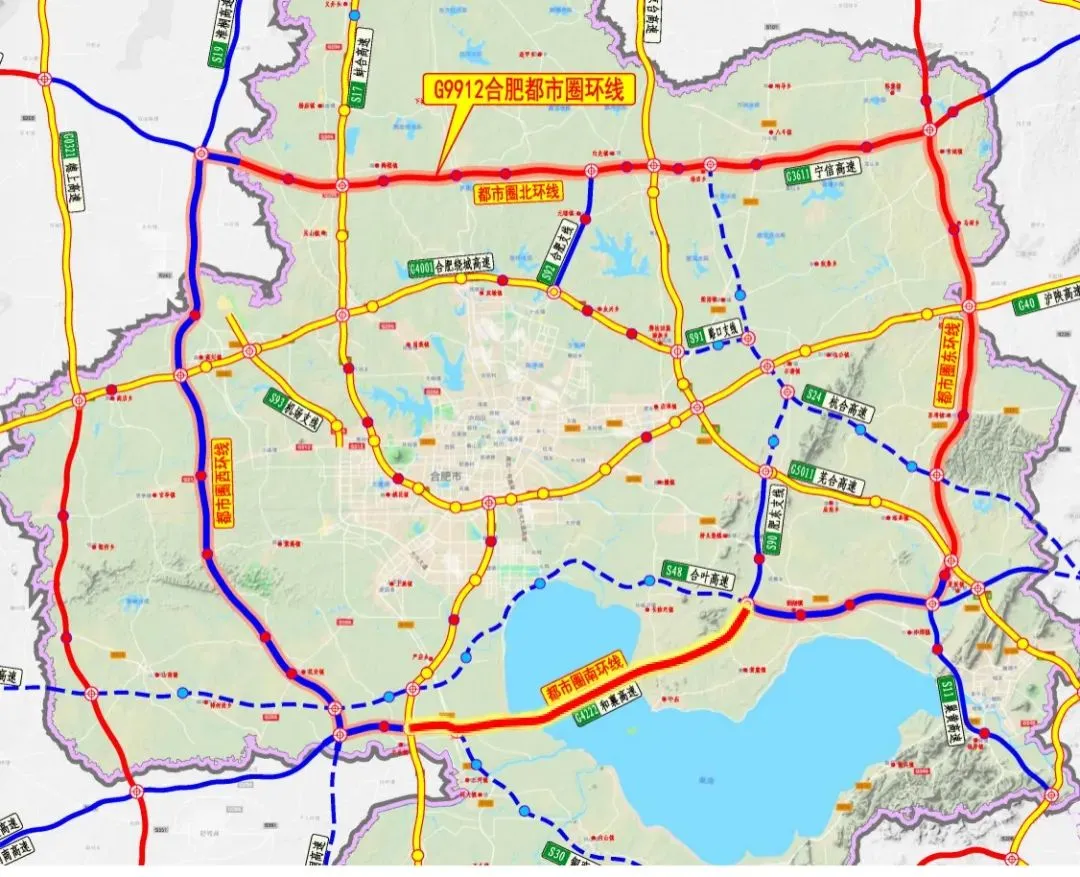其中,北环线为滁州至合肥至周口高速公路段,西环线为S19淮桐高速合肥段,南环线为S18宁合高速合肥段,东环线为明巢高速合肥段。