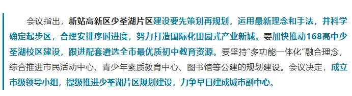 合肥市人民政府发布消息,市规委会第9次第10次重大项目专题会召开,提到新站区少荃湖片区发展建设,会议决定,成立市级领导小组,提级推进少荃湖片区规划建设,力争早日建成城市副中心。