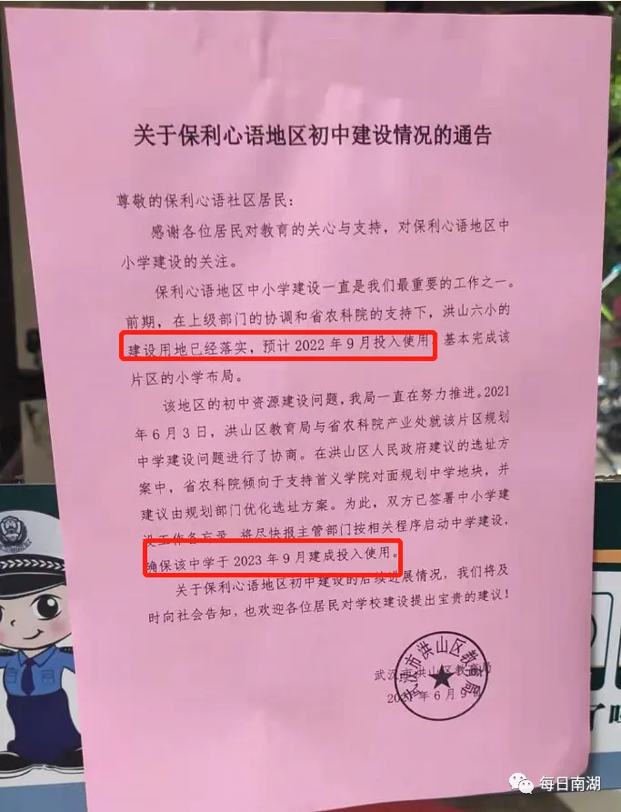 昨日,每日南湖获悉洪山六小开始设计招标。不少读者询问保利心语附近规划小学已见进展,那中学何时落地?目前,洪山六小的建设用地已经落实,预计2022年9月投入使用。关于保利心语初中资源建设问题,洪山区教育局与省农科院产业处就该片区规划中学问题进行了协商。在洪山区人民政府建议的选址方案中,省农科院倾向于支持首义学院对面规划中学地块,并建议由规划部门优化选址方案。目前,双方已签署中小学建设工作备忘录,将尽快报主管部门按相关程序启动中学建设,确保该中学于2023年9月建成投入使用。小编将持续关注南湖新闻,欢迎各位网友添加小编微信(nanhu927)加入每日南湖爆料讨论群参与讨论
