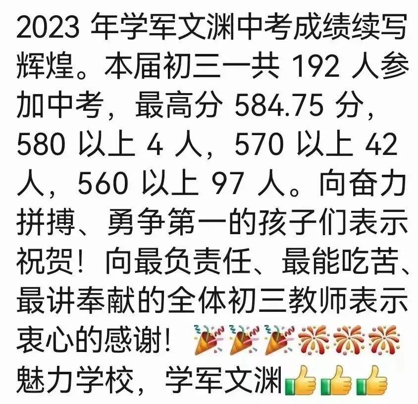 2023年中考,学军文渊共192人参加考试,最高分584.75分,560分(重高线558分)以上97人,重高率约50.52%。