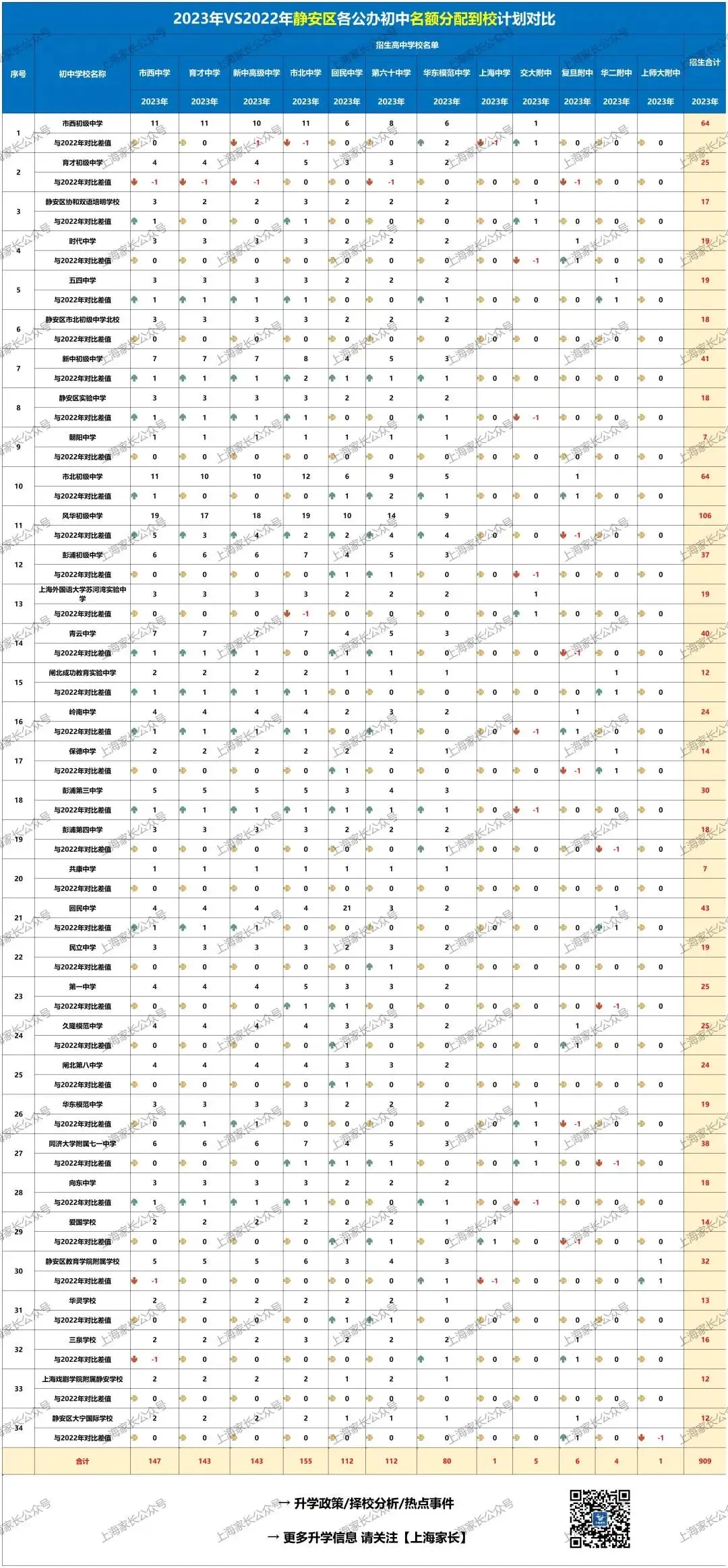 静安区区2023年共计34所公办初中获得“名额到校”资格,12所高中有“名额分配到校”计划,共计909个名额;分别为: