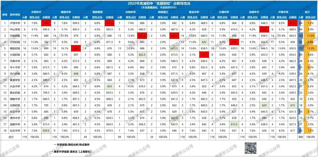2022年黄浦区名额分配到校招生人数以及分数线情况回顾: