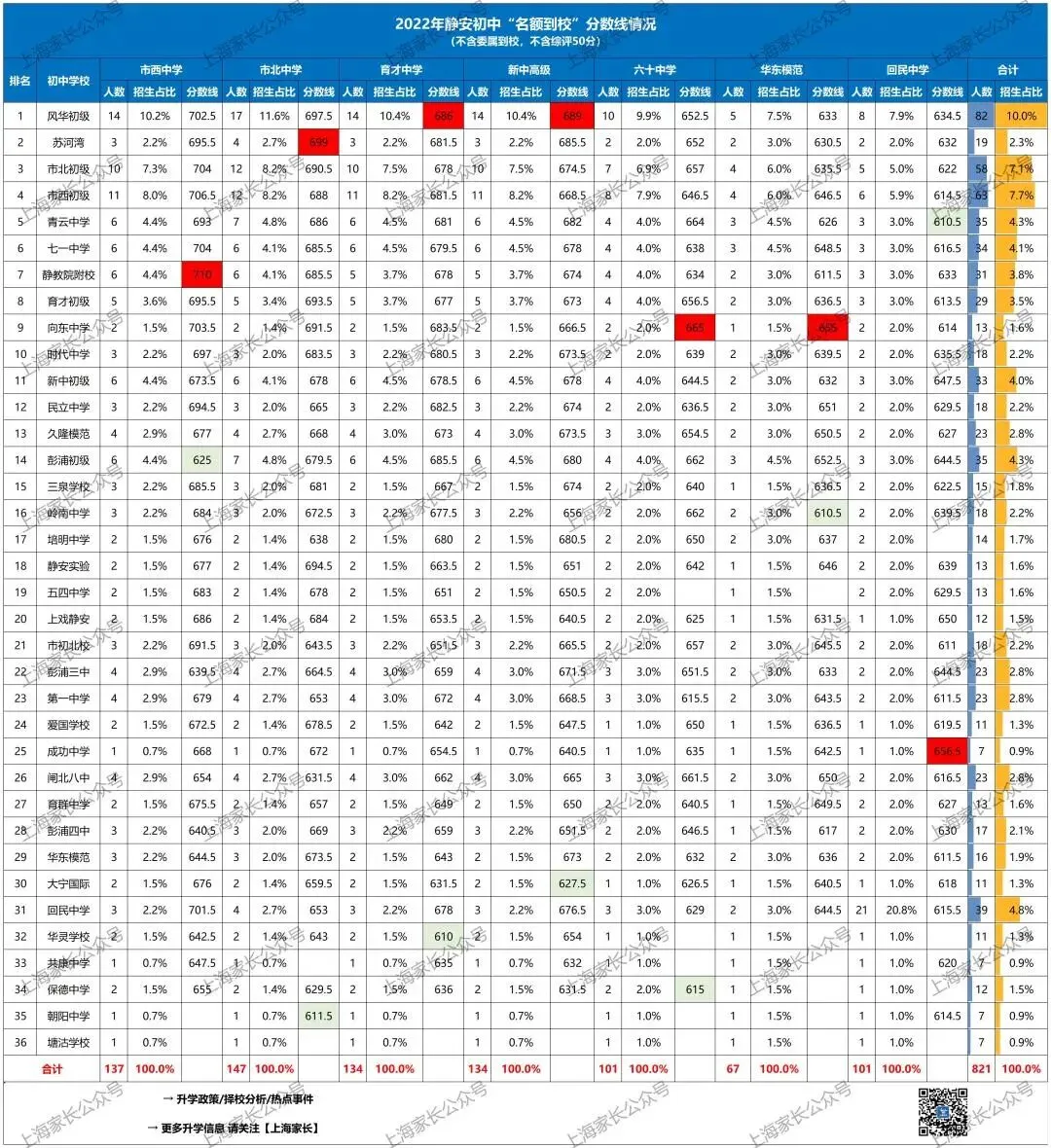 2022年静安区区名额分配到校招生人数以及分数线情况回顾:
