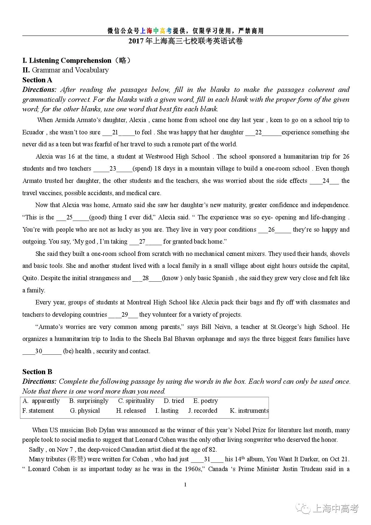 先前已经推送上海2017届高三7校联考语文数学英语试卷,今天我们推送七校联考英语卷(pdf+word)涉及的听力及其答案(由一个老师提供,在此表示感谢)。如需下载,可通过聊天对话框发送208获取网盘下载链接。其他联考卷可以点击菜单栏-高三题库进行查阅及其下载。