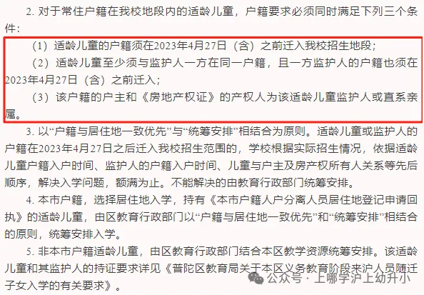 (1)适龄儿童的户籍须在2023年4月27日(含)之前迁入我校招生地段;