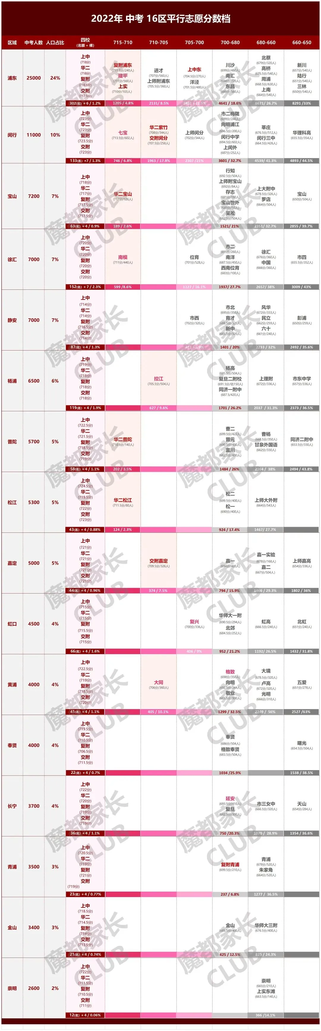 而从650分以上的高中来看,依旧是中考大区——浦东和闵行占大头,其他区按所占比例由高到低依次为:徐汇区、黄浦区、杨浦区、宝山区、静安区、普陀区、松江区、虹口区、嘉定区、长宁区、青浦区、奉贤区、金山区、崇明区。