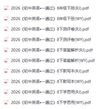 本篇分享的是2026《初中一遍过》英语 8年级下册 (RJ&WY),可选择部分转存下载,获取链接请下拉至文末《初中一遍过·英语》八年级下册(适配人教版RJ & 外研版WY)立足双教材同步,聚焦“学得会、练得准、考得好”三大目标,是夯实基础与冲刺高分的高效训练方案。全书按单元划分,每课设置“基础过关—能力提升—真题链接—易错清零”四阶训练,覆盖词汇、语法、阅读、完形、写作等中考核心板块。特色栏目如“考点微讲”直击重难点,“语境化练习”强化语言运用能力,“跨文化拓展”提升综合素养。针对RJ和WY版本差异,内容精准适配,一书两用。题型紧贴中考命题趋势,强调语篇理解与思维训练,帮助学生在“做一遍”中实现知识内化、技巧掌握、分数跃升,真正做到“一遍就过关”!