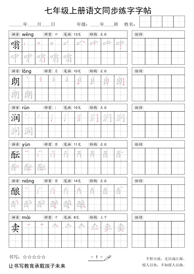 【初中资源】初中语文《同步练字帖》7-9年级上册(2025暑假预习必备)