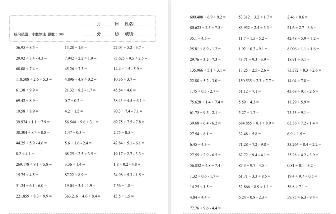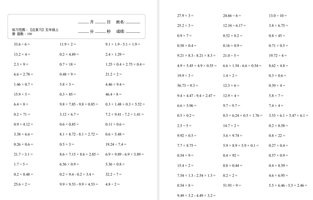 - 性价比超高,小学 6 年都能用 ♻️一套资料覆盖 1-6 年级,从小学入学用到毕业,不用年年买新的口算题卡。打印出来装订成册,娃可以随身携带,课间、放学路上都能拿出来练两道,碎片时间全利用!