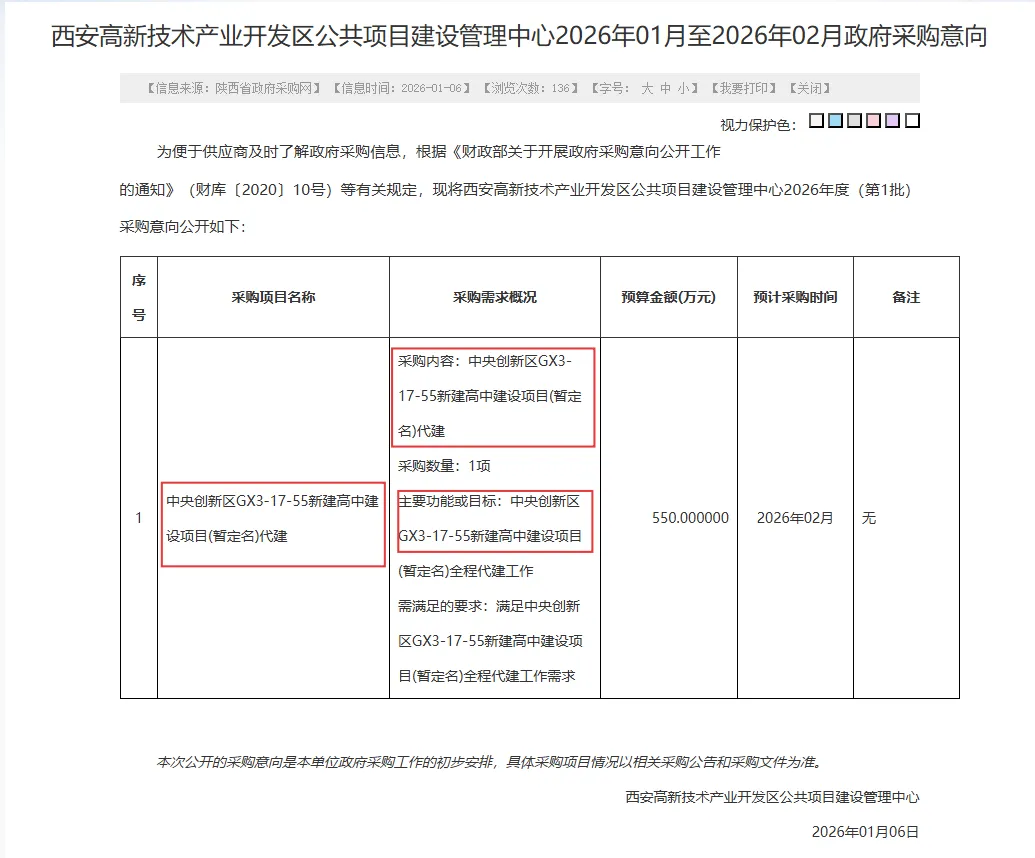 2026年1月6日,西安高新发布的政府采购意向项目: