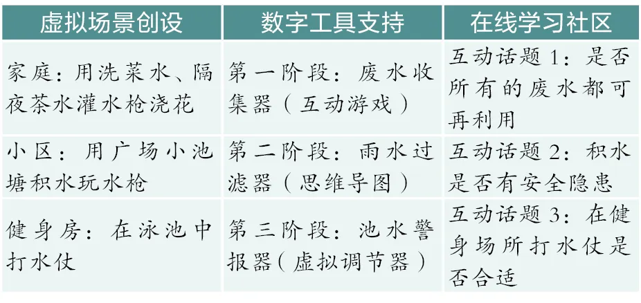 下面以“小水滴的诉说”教学内容为例进行分析。教师将“节约用水”规范转化为可感知的情境化数字模拟场景:整合图像与声音,直观对比“西北干旱儿童日用水量(10 升)”与“玩10分钟水枪耗水量(50 升)”,以感官冲击引发思考;利用数字动画创设家庭、社区、健身房三处道德分支场景,如家庭“用洗菜水、隔夜茶灌水枪浇花”、社区“用小池塘的积水玩水枪”等两种虚拟场景,提供家庭与公共场景水利用及安全评估表(见表2)作为互动话题锚点,引导学生记录用水现象,判断用水安全,围绕家庭节水、公共节水责任、玩水枪是否浪费水在线展开讨论,多元观点碰撞(如“偶尔玩水枪可以,但不能频繁”“玩水枪完全是浪费水”),体会节水行为的复杂性,在自主分析中深化“节水行为与他人福祉关联”的认知。互动中,学生依托数字工具参与节水活动,上传家庭、社区节水照片,分享节水技巧,使“不浪费水资源”的道德规范在互动中自然内化,助力学生在日常生活中主动践行节水行为。