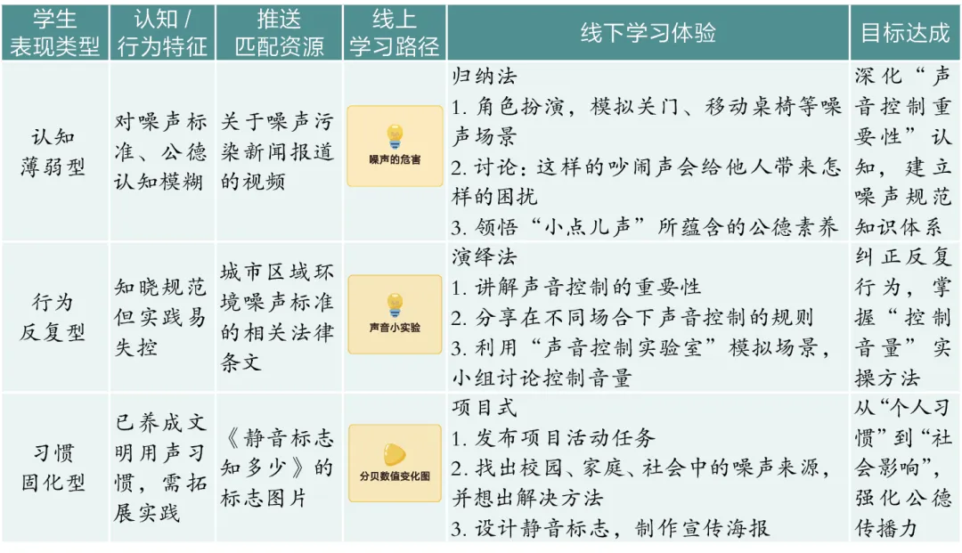 下面以“我们小点儿声”为例进行分析(见表3)。教师利用数字平台构建情景模拟答题环节,如“在图书馆发现同伴大声说话如何应对”,并通过语音识别技术监测“现场关门”等行为音量。借助人工智能,教师收集分析学生行为数据,识别认知薄弱型、行为反复型、习惯固化型等学生群体,推送匹配资源开展动态学习与反思重建。基于诊断结果,教师精准分析学生个性化学习需求,对认知能力较弱的学生推送“城市区域环境噪声标准”等资源让其动态学习,深化对声音知识的理解;对行为模式反复的学生,引导他们参与“声音控制实验室”等线下活动学习控制音量;对已养成良好习惯的学生,鼓励他们设计文明用声宣传作品,加强社会学习体验。