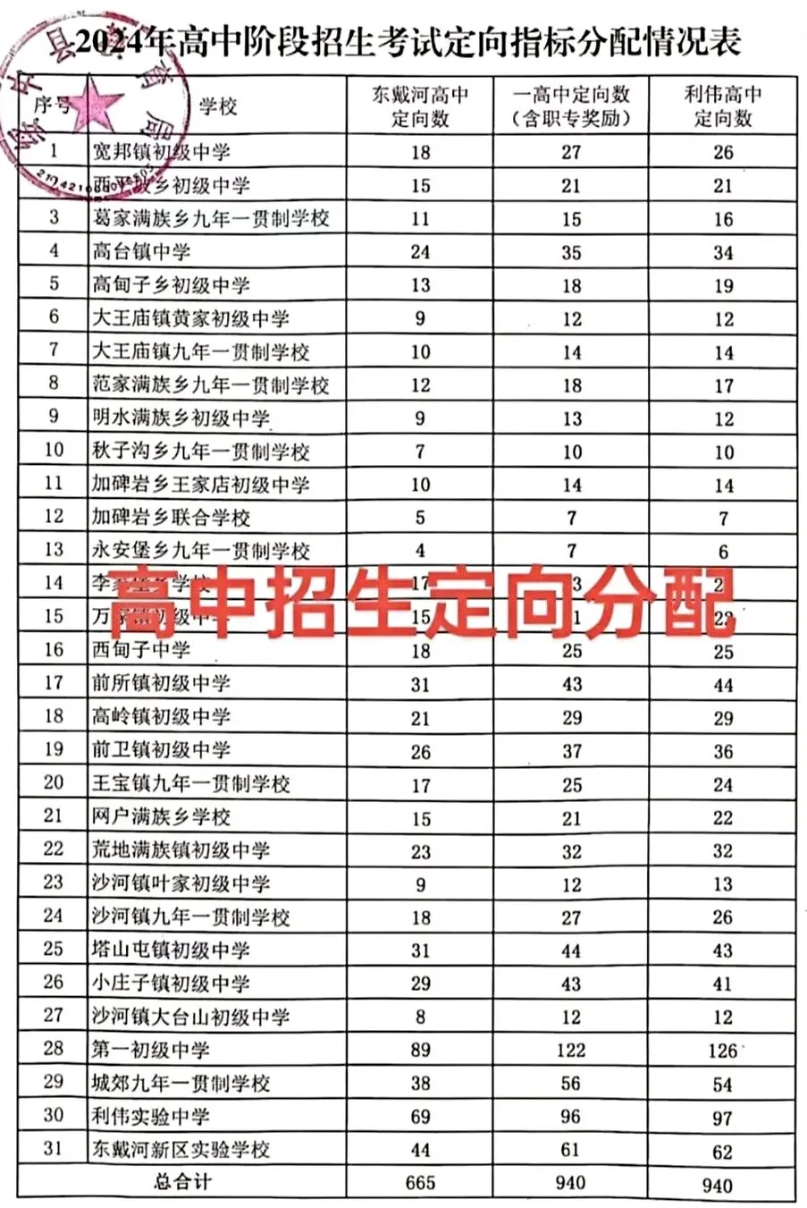 省实验中学东戴河分校为绥中县中考第一批次录取学校,招生政策为95%的指标定向分配至县内各初中,仅余下5%用于全县择优录取;近年另新增50个跨考区名额,面向葫芦岛市域内绥中县以外的学生择优招录。2024年高中阶段招生考试定向指标分配情况表所示,绥中县31所初中按应届毕业生人数比例,分配3所省示范性高中95%定向指标,且仅初一至初三全程在校就读的学生具备申请资格,也就是说初中阶段转学进入县内学校的学生,中考时无法参与定向名额竞争,只能角逐5%的择优录取指标。