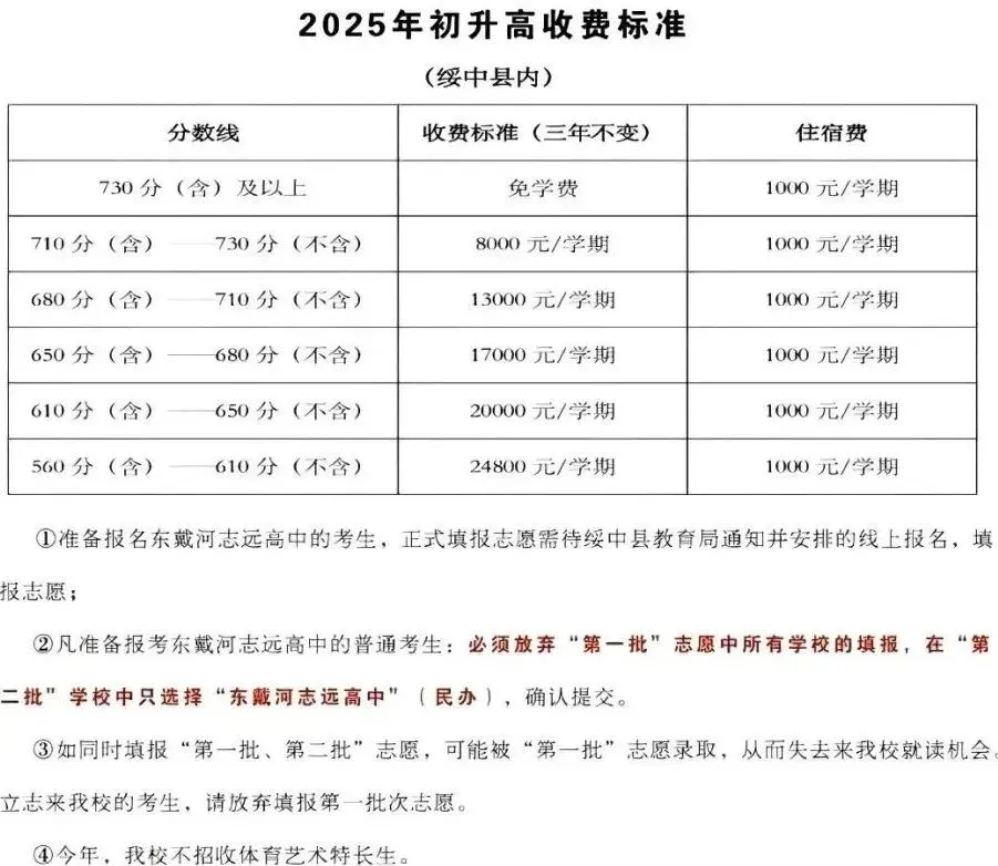 2025年东戴河志远高级中学初升高收费标准:中考成绩730分及以上的学生,每学期仅收取1千元住宿费;其他学生则按中考分数段划分,费用为每学期8千元学费+1千元住宿费至2万4千8百元学费+1千元住宿费不等。