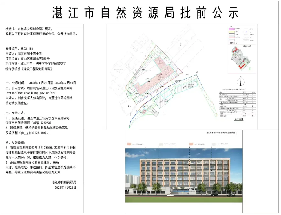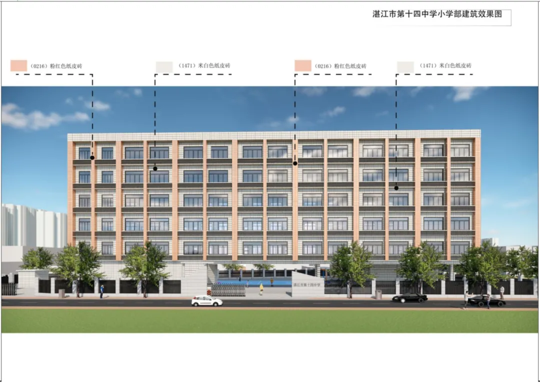 霞山区的家长们有福了!湛江市第十四中学小学部项目正在稳步推进,选址霞山椹川东三路 9 号,总建筑面积 6681.35 平方米,新建 6 层教学楼和综合楼各一栋。