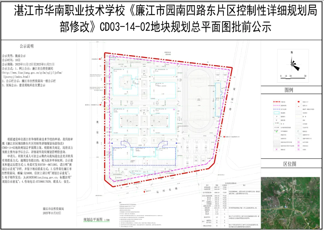 廉江教育再添新力量!湛江市华南职业技术学校廉江校区已于 2025 年 11 月动工,计划总投资 1.5 亿元,选址廉江市城东片区,规划占地面积 88 亩。