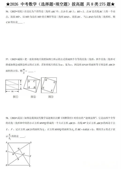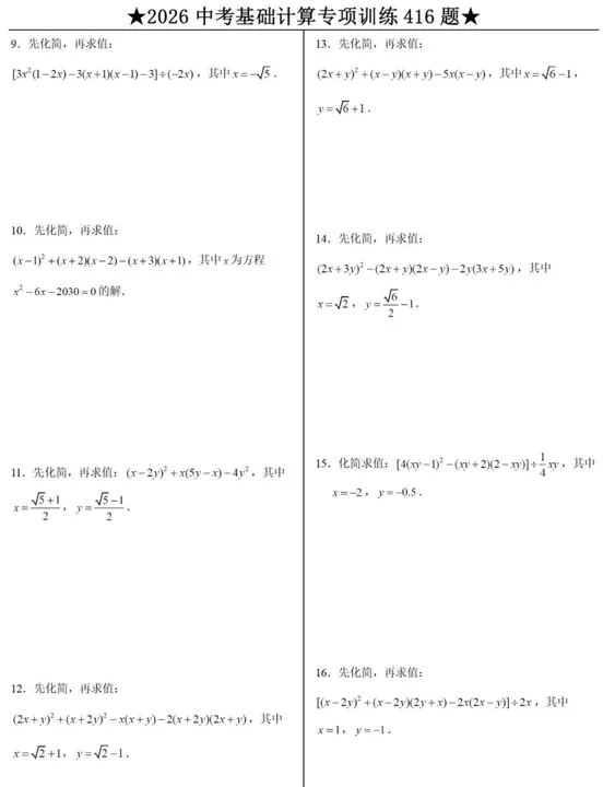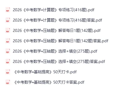 本篇分享的是2026《中考数学•专项训练题》基础提高、计算题、选填压轴、解答压轴,获取链接请下拉至文末 2026《中考数学•专项训练题》专为初中生设计,助力中考数学备考。基础提高部分聚焦核心概念,通过典型例题巩固代数、几何基础知识,强化运算能力,为后续学习筑牢根基。计算题专项针对易错点,如分式运算、方程求解,提供大量练习,提升解题速度和准确性。选填压轴题精选高频考点,涵盖函数、几何变换等难点,通过变式训练培养灵活思维,适应中考选拔性要求。解答压轴题则深入解析几何证明、函数综合应用等复杂题型,强调逻辑推理和问题拆解能力,帮助学生攻克高分瓶颈。全书结构清晰,从基础到拔高循序渐进,结合真题改编和名师解析,确保学生掌握解题技巧,从容应对中考挑战。