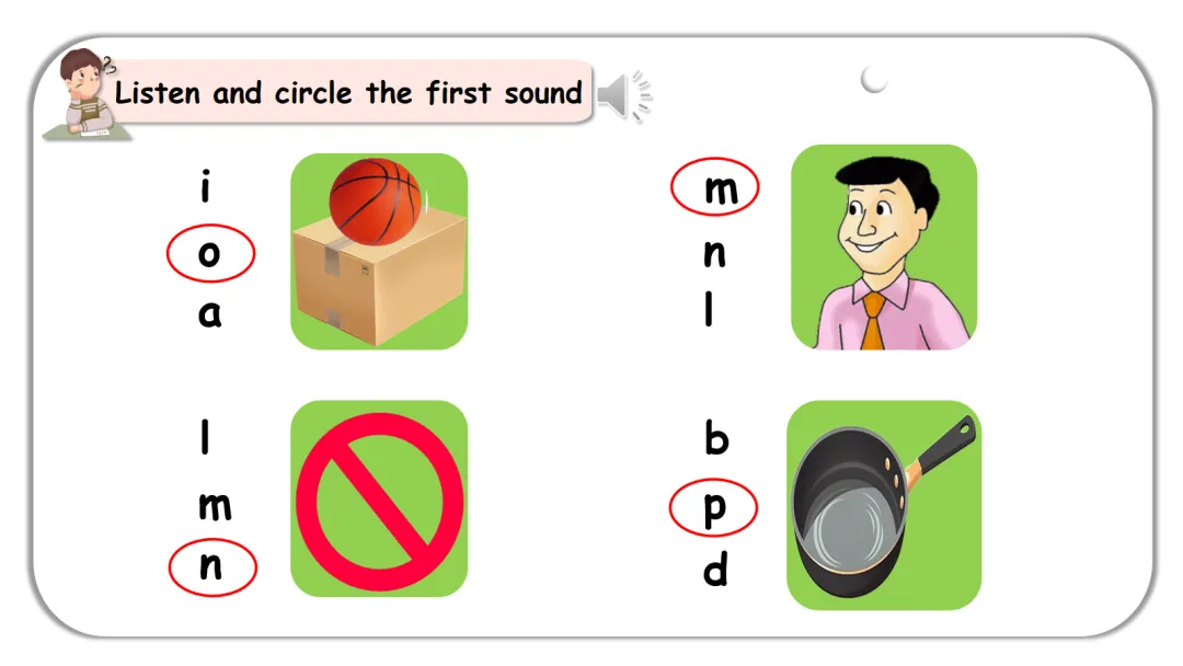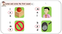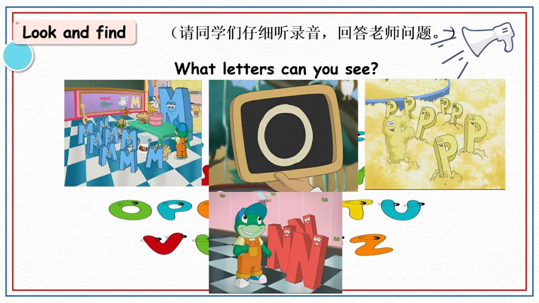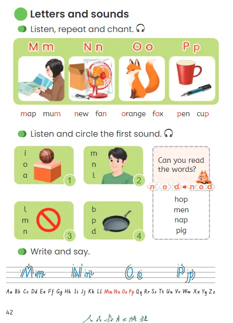 2.正确辨别Mm、Nn、Oo、Pp在单词中的发音,并完成相应的跟读,听音圈首字母活动 | 4. Let’s do 教师呈现四线三格中的字母,并让学生做字母操。 5.Listen and circle
