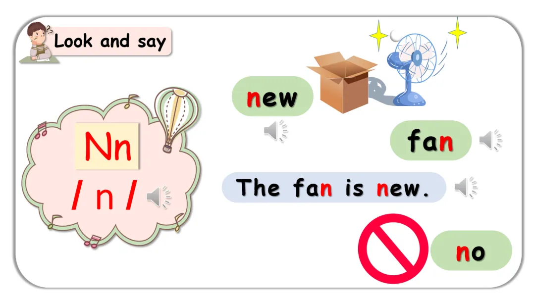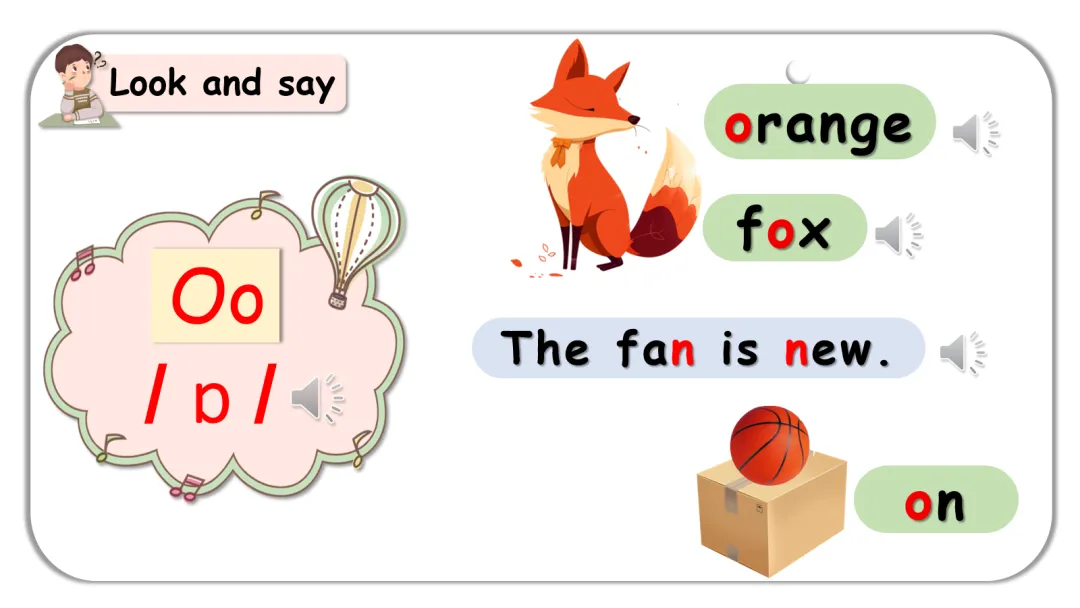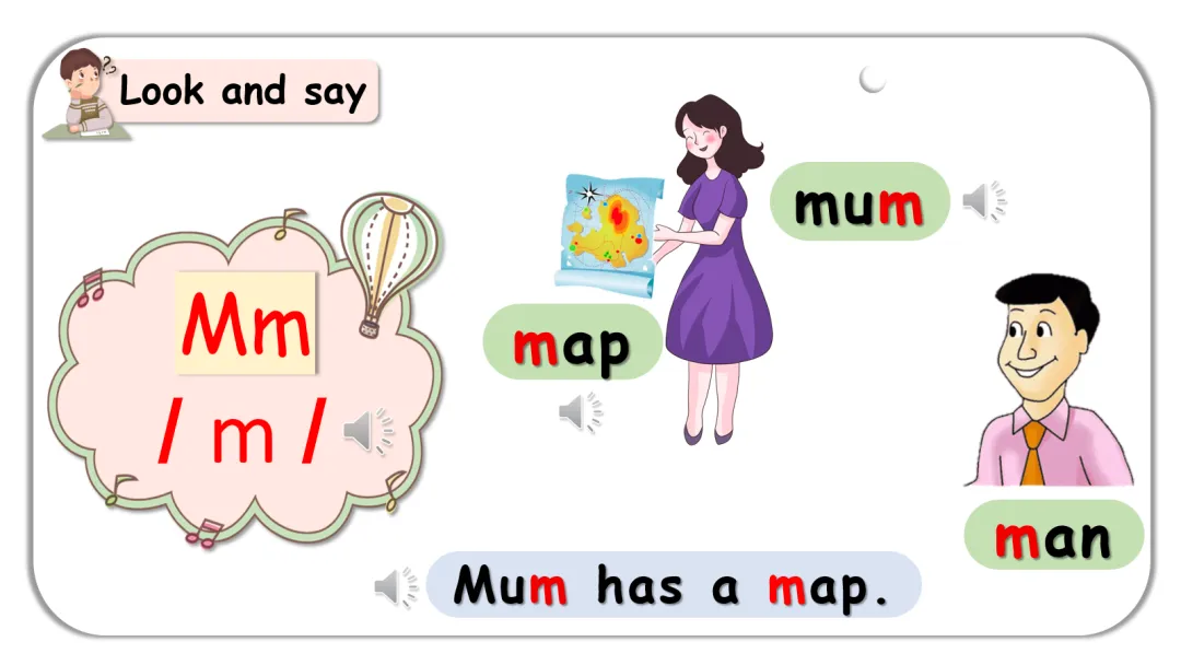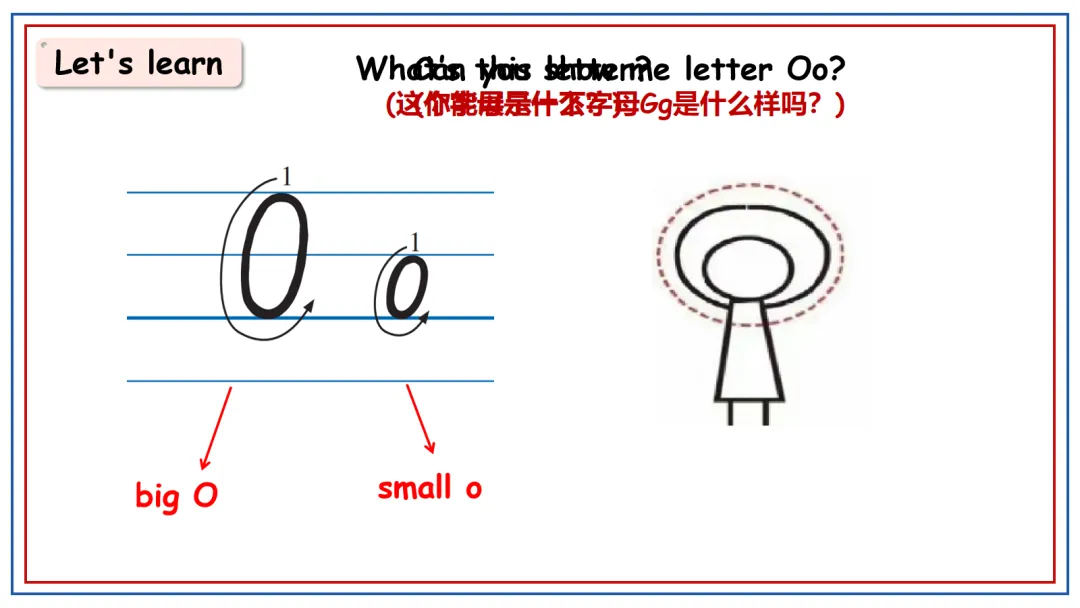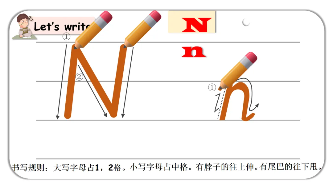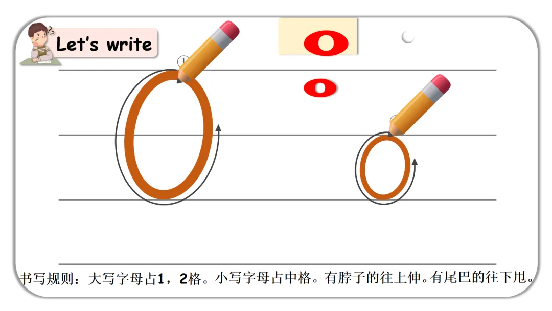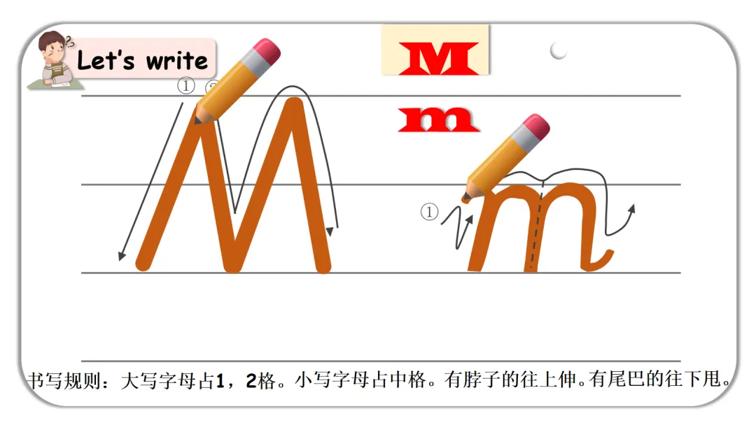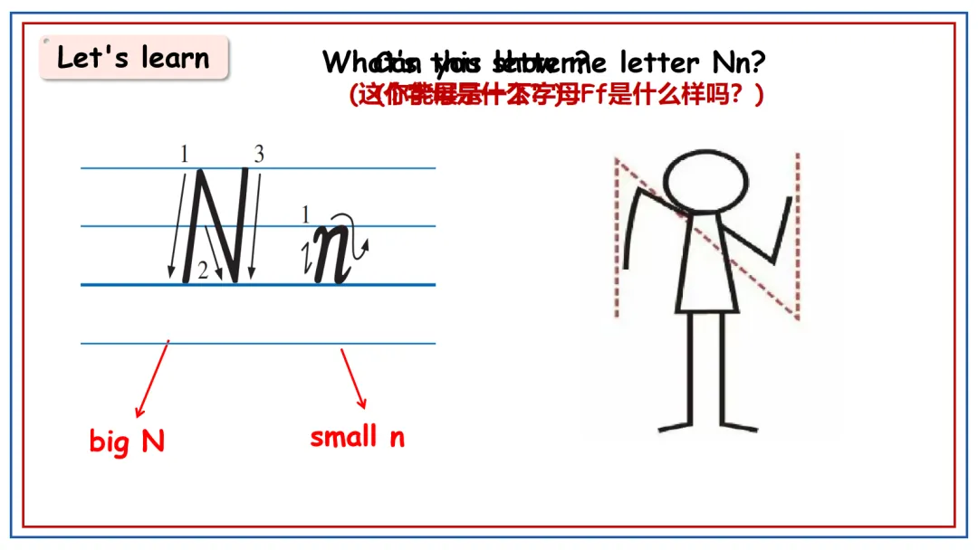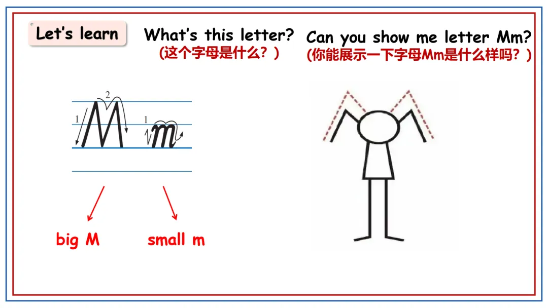 1.通过听歌谣和录音、看图片、跟读、做动作等形式,辨别Mm、Nn、Oo、Pp的音、形、序,识别字母的大小写并在四线三格中正确书写; | 1. Let’s sing 2. Look and find 教师播放录音,并提问:What Letter friends will we meet? 3. Let’s learn 教师出示字母Mm、Nn、Oo、Pp的图片,并提问:What’s this letter? Can you show me? | 1.学生听一首自然拼读歌,继续感知字母的音,同时复习上个单元所学字母的音、形、序。 2.学生仔细看图,并回答从图中看到了哪些字母:Mm、Nn、Oo、Pp。 3.学生通过看图回答教师问题,并正确跟读字母Mm、Nn、Oo、Pp的名称音,明白有大小写,同时作出相应字母的形状,初步感知字母的形。 | |