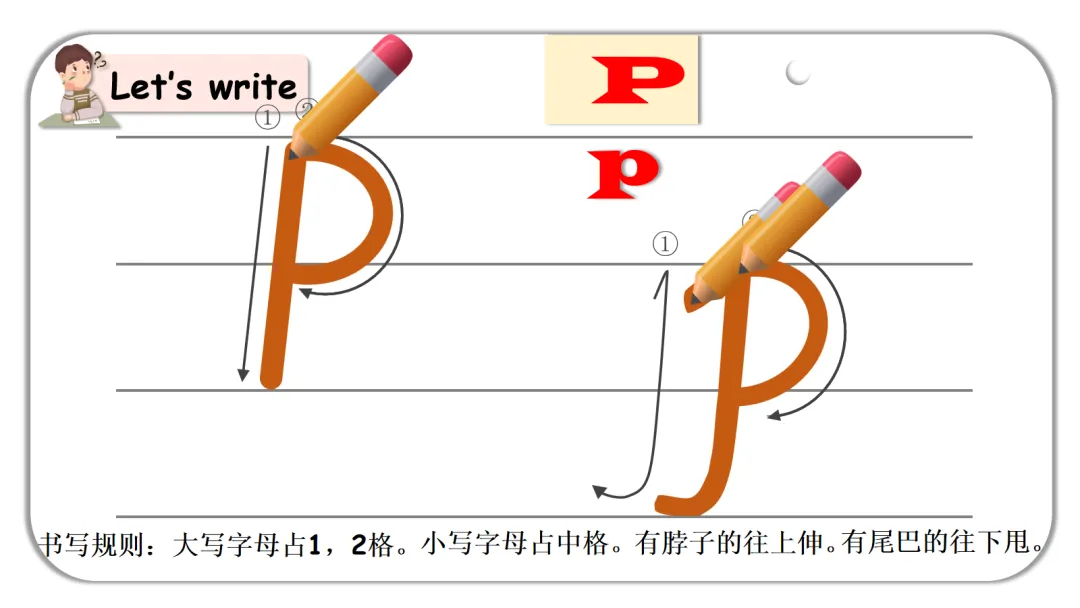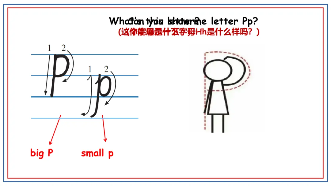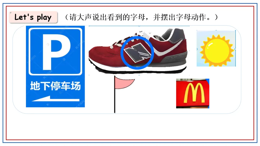 | 4. 学生通过看对应字母操的图片学习字母的形,并大声读出来。 5. 学生根据单词发音整体感知字母的音和序。 6.完成书本练习,听音圈出正确的字母,进一步加强对字母音形序的理解。 7.学生仔细观察图片,发现大写字母占一、二格,小写p、q占二、三格。 8.教师呈现字母碎片,鼓励学生将这些字母拼读出来。 | 应用实践 迁移创新 |