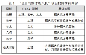 确立主题是项目式学习的首要环节。该环节强调以课程教材内容为依据,从学生的实际学情出发,结合专业核心技能与真实生产问题,选择贴近行业需求的主题。作为公共服务平台,智慧教育平台整合了特定区域内乃至全国的优质数字资源,包含教材知识、实验教学精品课、云课堂微课视频、在线题库、优秀教案和复习课视频等教学资源,为STEAM理念下项目式学习的实施提供了多元化的教育服务支持。本文以人教版初中物理九年级全一册第十三章“内能”为知识背景,构建项目式学习框架。在项目策划阶段,教研组利用智慧教育平台搜索“STEAM理念”“‘内能’跨学科教学”等关键词,了解相关项目案例,并立足实际教学条件,确定项目式学习主题为“设计与制作蒸汽机”。该主题项目属于实物制作类项目,具有鲜明的物理学科属性,涵盖热力学、能量转换、机械运动等核心知识,同时融入了工程、艺术、历史知识等跨学科内容,能有效贯彻STEAM理念,具体项目内容见表1。