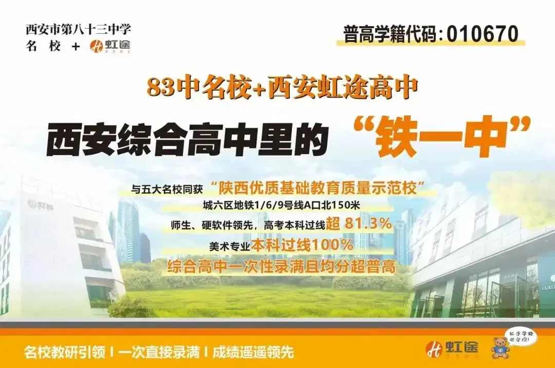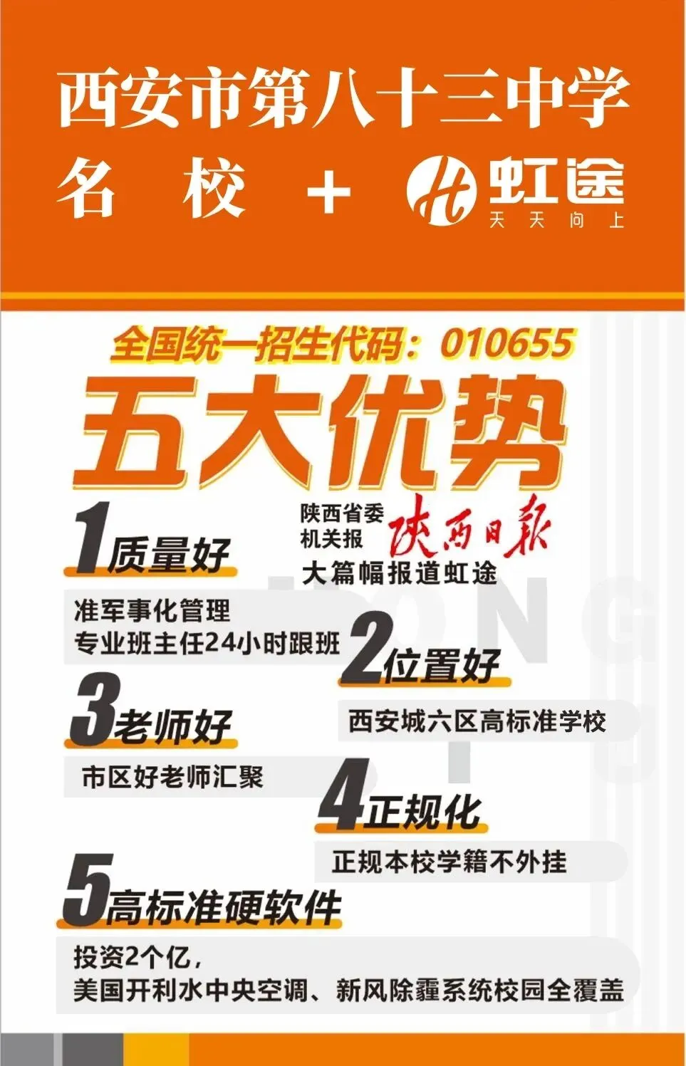 八十三中,这所拥有数十年办学历史的省级示范高中,以其深厚的文化底蕴、优质的教学资源和卓越的教学质量享誉西安。虹途综合高中作为“名校+”合作校,不仅共享八十三中教学资源和师资培训体系,更在教育教学的每一个环节中注入名校基因,确保办学的高起点和高标准。在虹途,学生能够享受到与名校同步的教学计划、同步的教学研究、同步的考试评价。这种深度的融合,让虹途的学生在起点上就站在了更高的平台,拥有了更广阔的视野。这种“与名校同行”的教育模式,正是虹途综合高中能够在短时间内迅速崛起的重要原因。关于更多西安私立高中