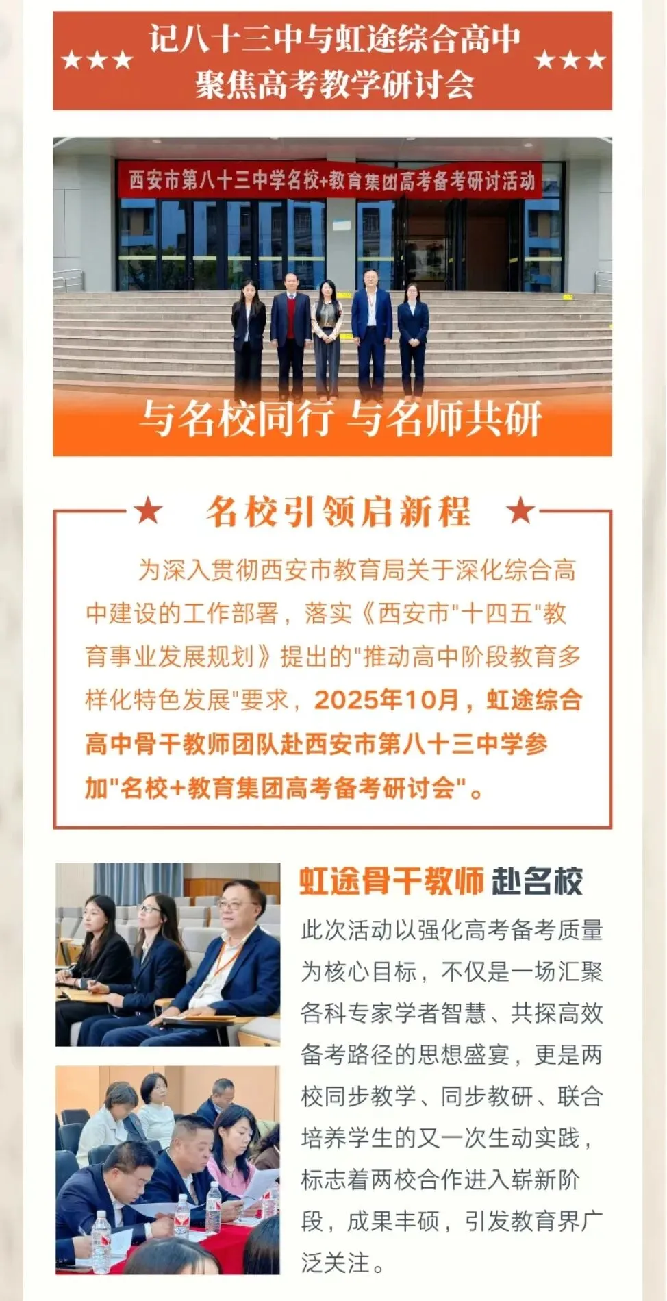 虹途综合高中以独特的办学理念和显著的办学成果,越来越多家长和学子的关注。作为西安市第八十三中学“名校+”教育联合体的深度合作校,虹途综合高中正在书写着一所新兴高中如何借助名校资源,实现跨越式发展的教育佳话。