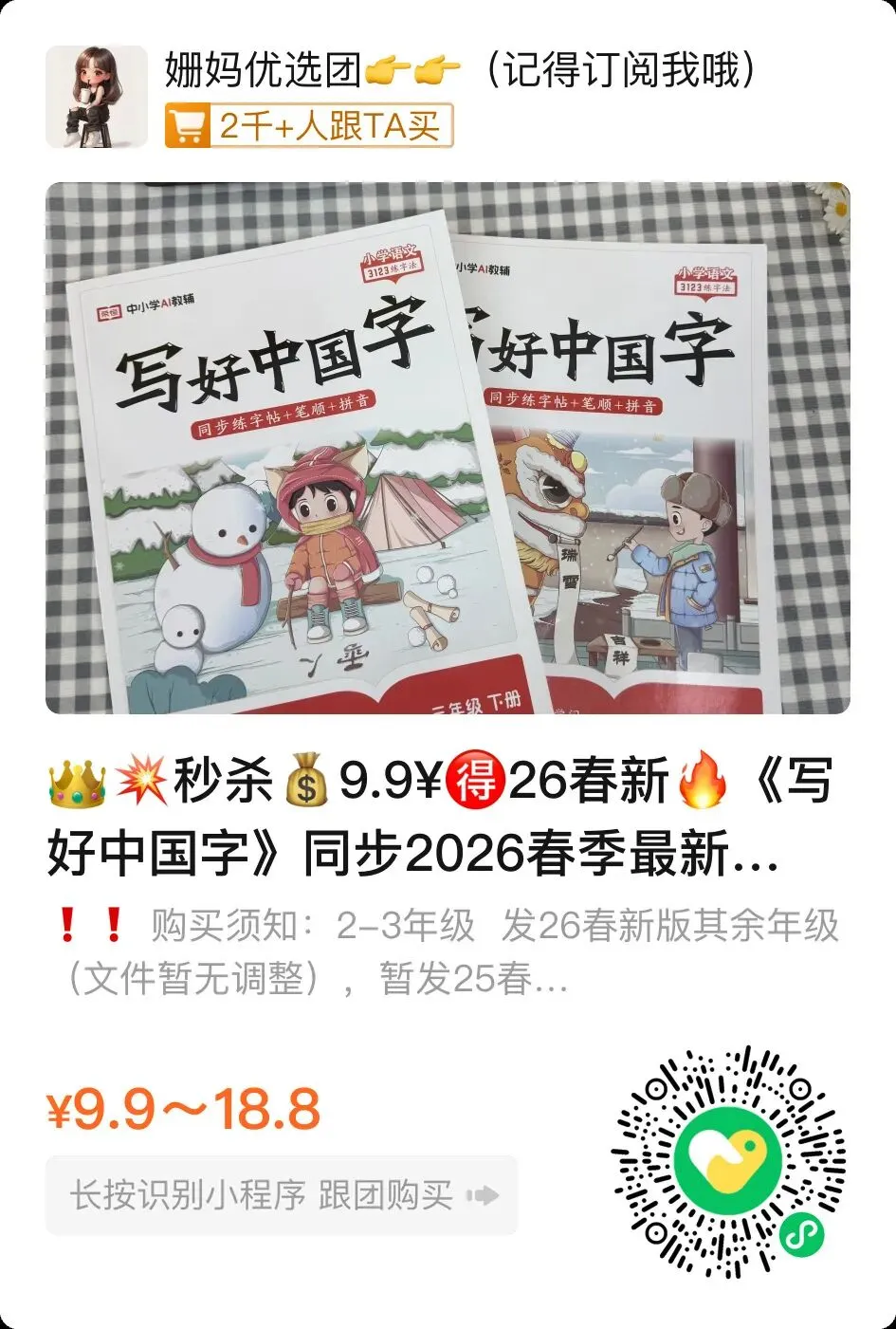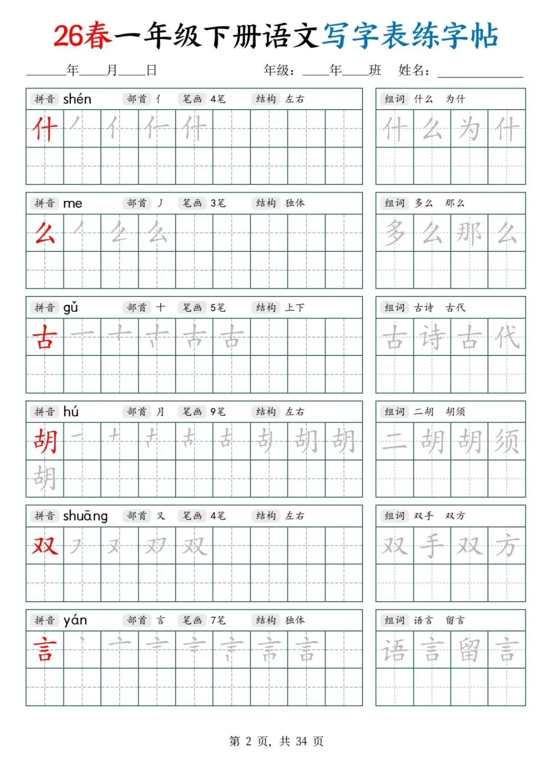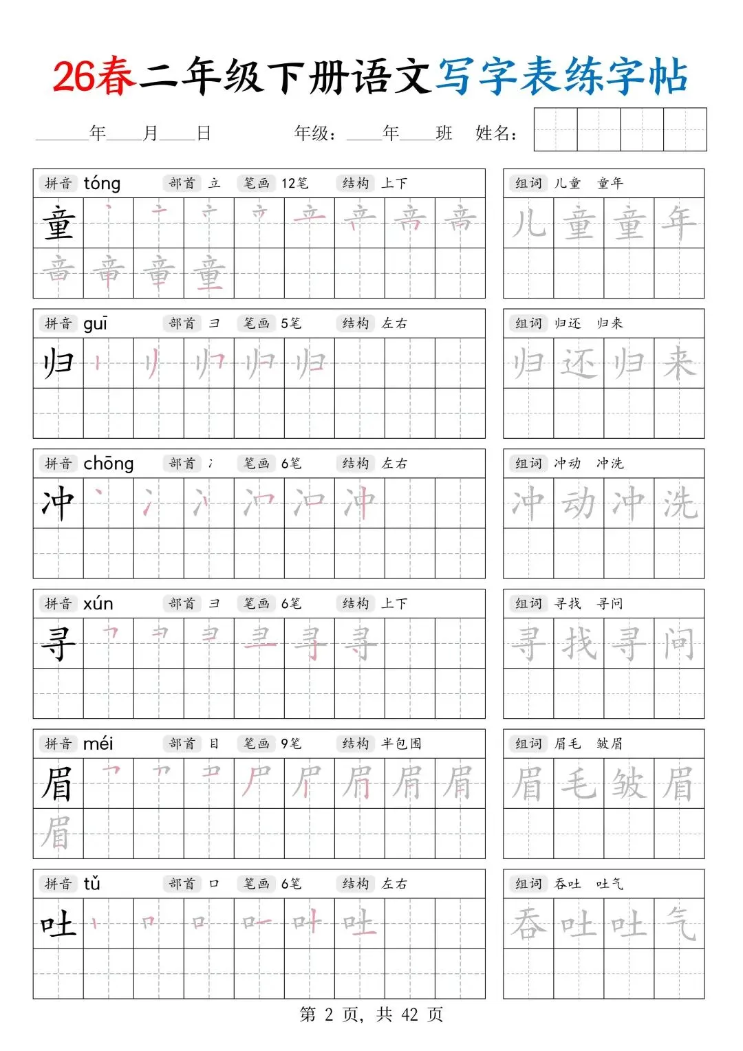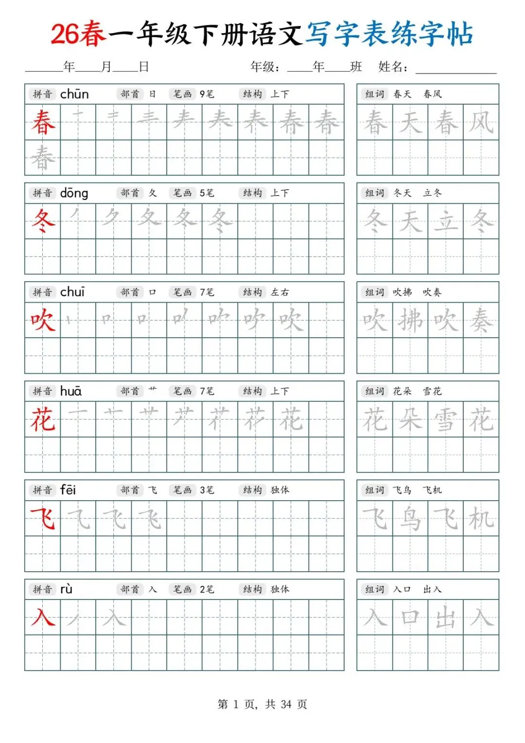 🔥🔥26春1-6年级语文下册《写字表字帖》