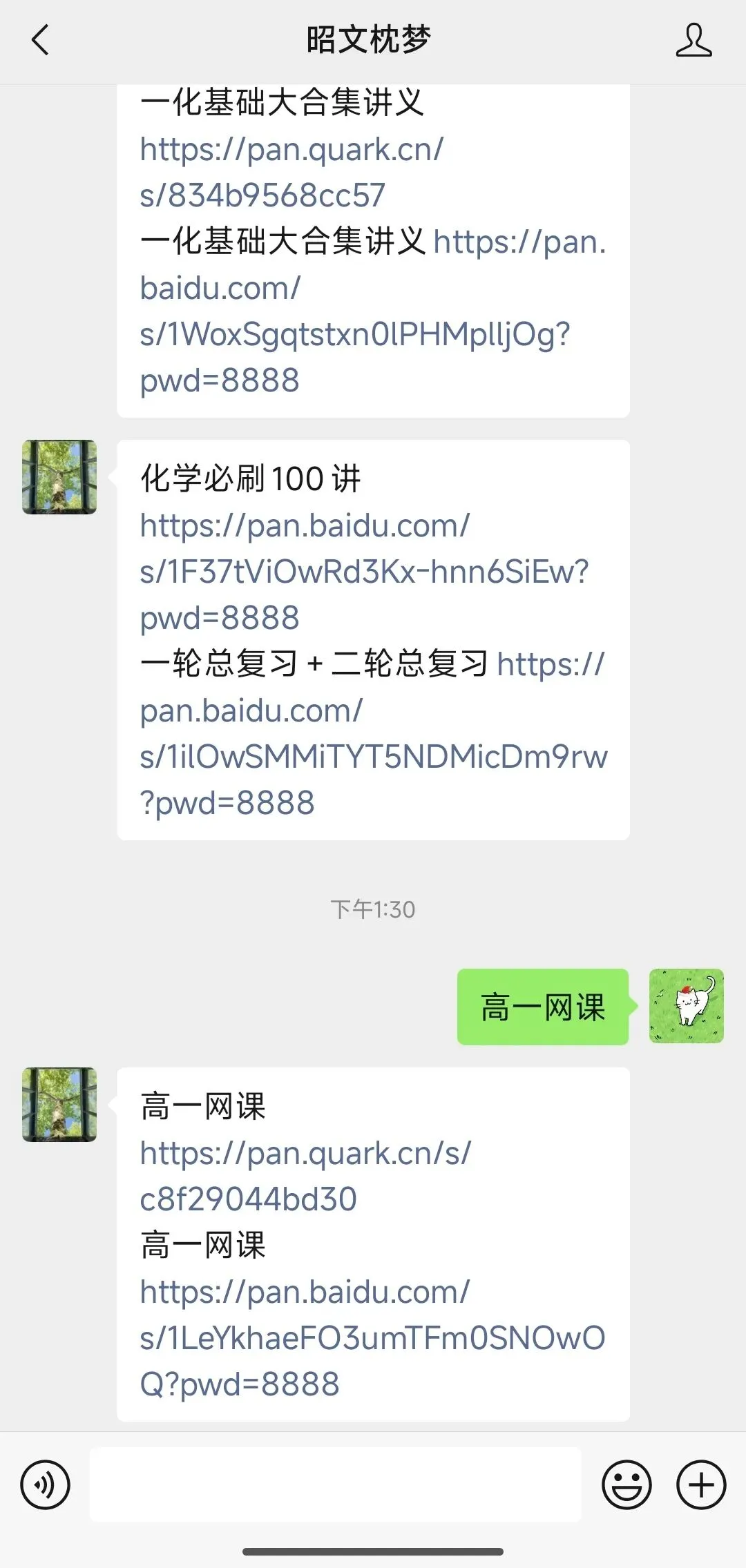 ①输入关键词获得相应的资料链接,如“网课”“一轮复习”“高中真题”等等