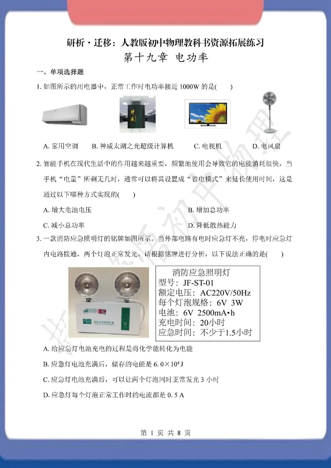 >【教学资源】研析·迁移:人教版初中物理教材资源拓展练习——电功率(天津市静海区第七中学 陈树文)