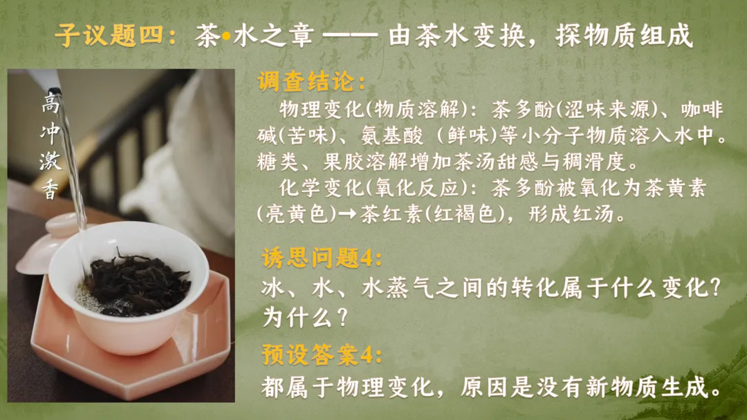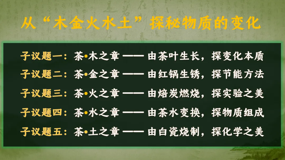 >F438 项目式学习 优质课资源 初中化学《专题复习--茶中五行--探秘物质的变化》课件PPT+教学设计Word