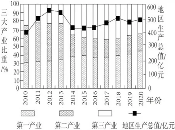 双鸭山市位于黑龙江省的东北部、三江平原腹地,隔乌苏里江与俄罗斯相望,人口约120.9万人,耕地面积为10600km²,占全市土地总面积的47.98%,农业结构中水稻、玉米、大豆种植业占比在80%以上。该市煤、铁等矿产资源、耕地资源、湿地资源、动植物资源丰富,2010年前曾是黑龙江省著名的“煤城”,2011年被国务院批准为第三批资源枯竭城市,现仅有黑龙江能源职业学院一所科研院校,科研机构也很少。下图为2010—2020年双鸭山市地区生产总值和三大产业比重。