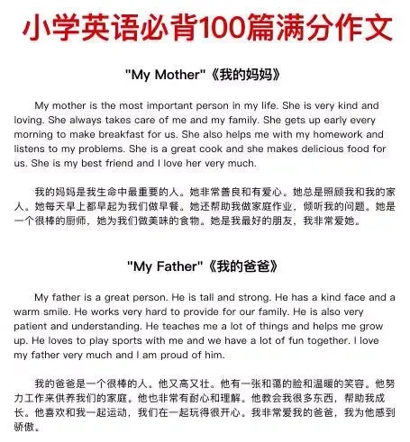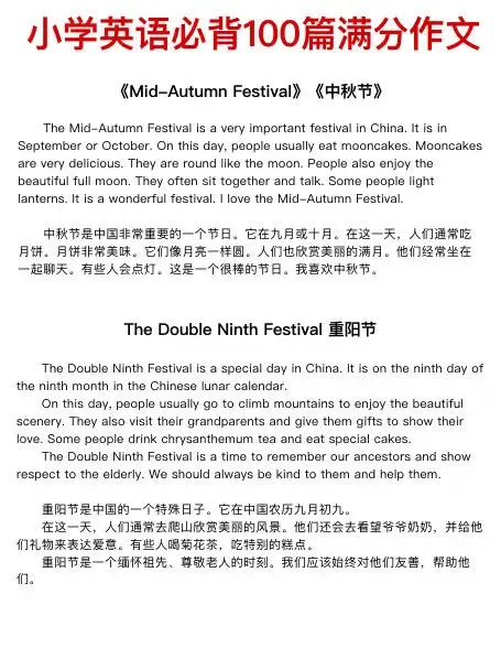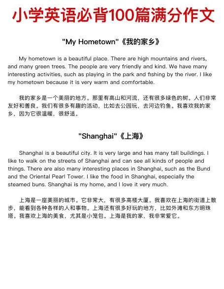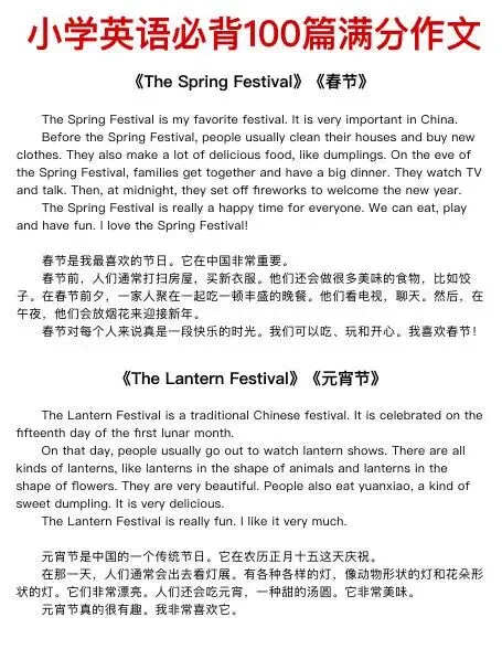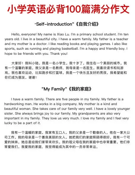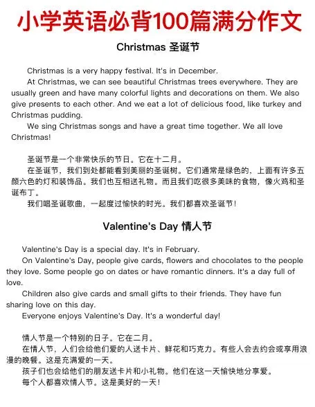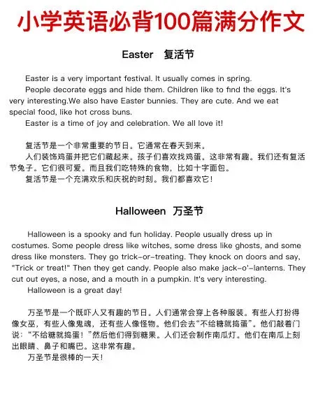 今天给带来100篇小学英语满分作文,主题包含节日、自我介绍、家庭成员、兴趣爱好、学校、运动、季节天气、梦想、旅行、动植物、自然等等。