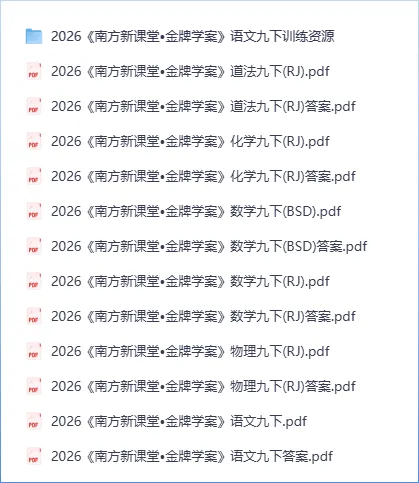 本篇分享的是2026《南方新课堂•金牌学案》语、数学、物、化、道 9下(人教&北师大),持续更新!!获取链接请下拉至文末 覆盖语文、数学、物理、化学、道德与法治五大核心学科,严格依据人教版、北师大版等主流教材及最新课程标准编写,贴合中考命题趋势。《南方新课堂•金牌学案》以“夯实基础、分层突破、高效备考”为核心理念,每科均设置“知识梳理”“考点精讲”“分层训练”“中考模拟”等模块,系统整合教材要点,精准剖析高频考点,强化解题思维训练。配套作业本与测评卷,实现“讲—练—测”闭环学习,助力学生稳步提升成绩。作为广东省多地推荐的优质教辅,该书既适合日常同步学习,又能无缝衔接中考复习,是九年级学生科学备考、全面提升学科能力的可靠选择。