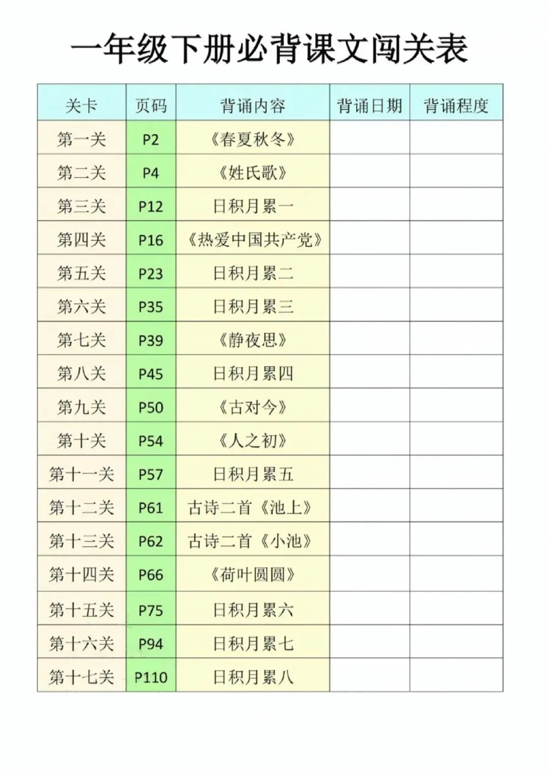 今天给大家带来的是《必背课文闯关表》,现在免费分享给大家,建议分享到班级群,让家长打印出来,帮助孩子学习!如需下载电子版文档,请拉到文章最底部。