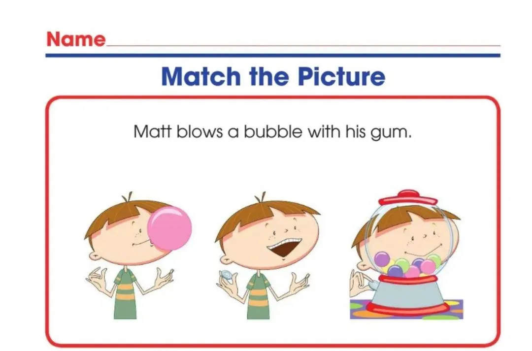 给一个句子,让孩子选出哪幅图画是这个句子描述的场景;