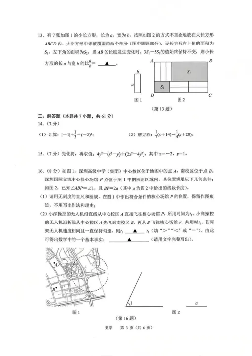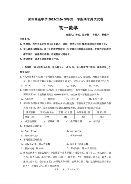 本篇分享的是2025-2026学年深圳高级中学7上期末考试数学试卷,持续更新!!获取链接请下拉至文末 - 难度适中偏上:题目注重基础概念和核心知识的考查,同时包含一定比例的综合题和思维题,难度略高于区统考水平