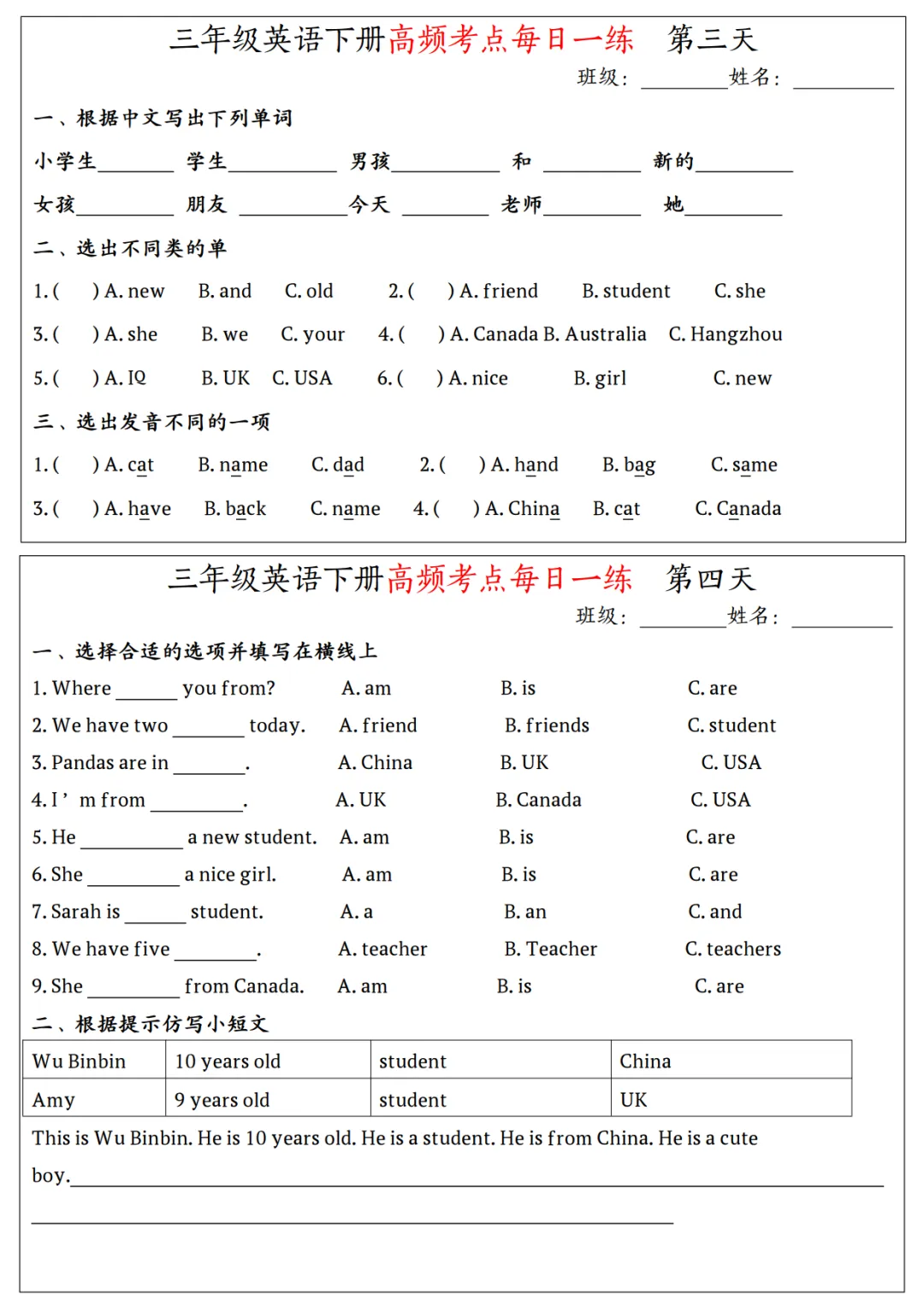 三年级有18天的练习内容