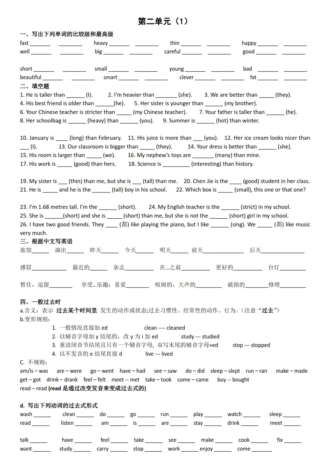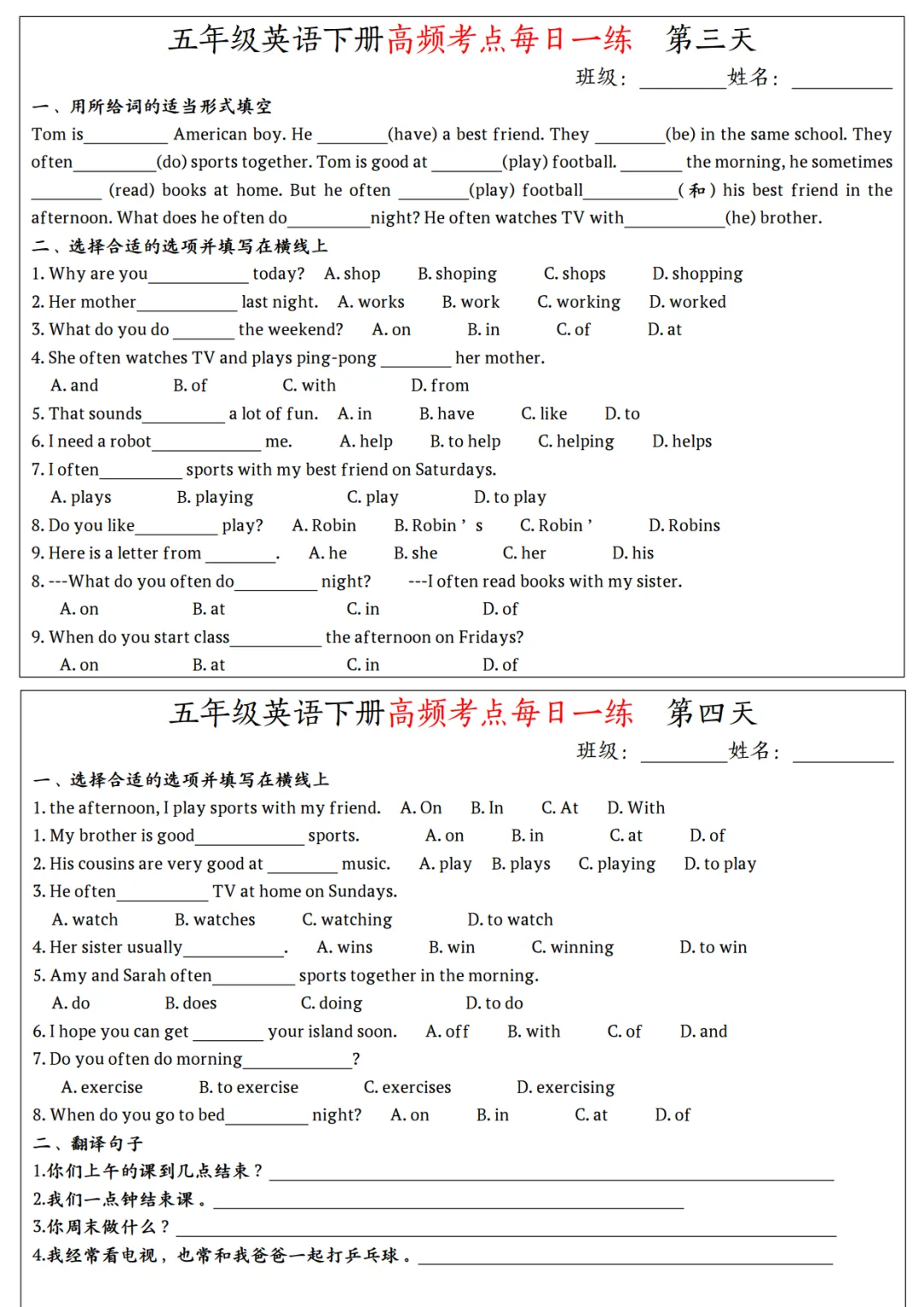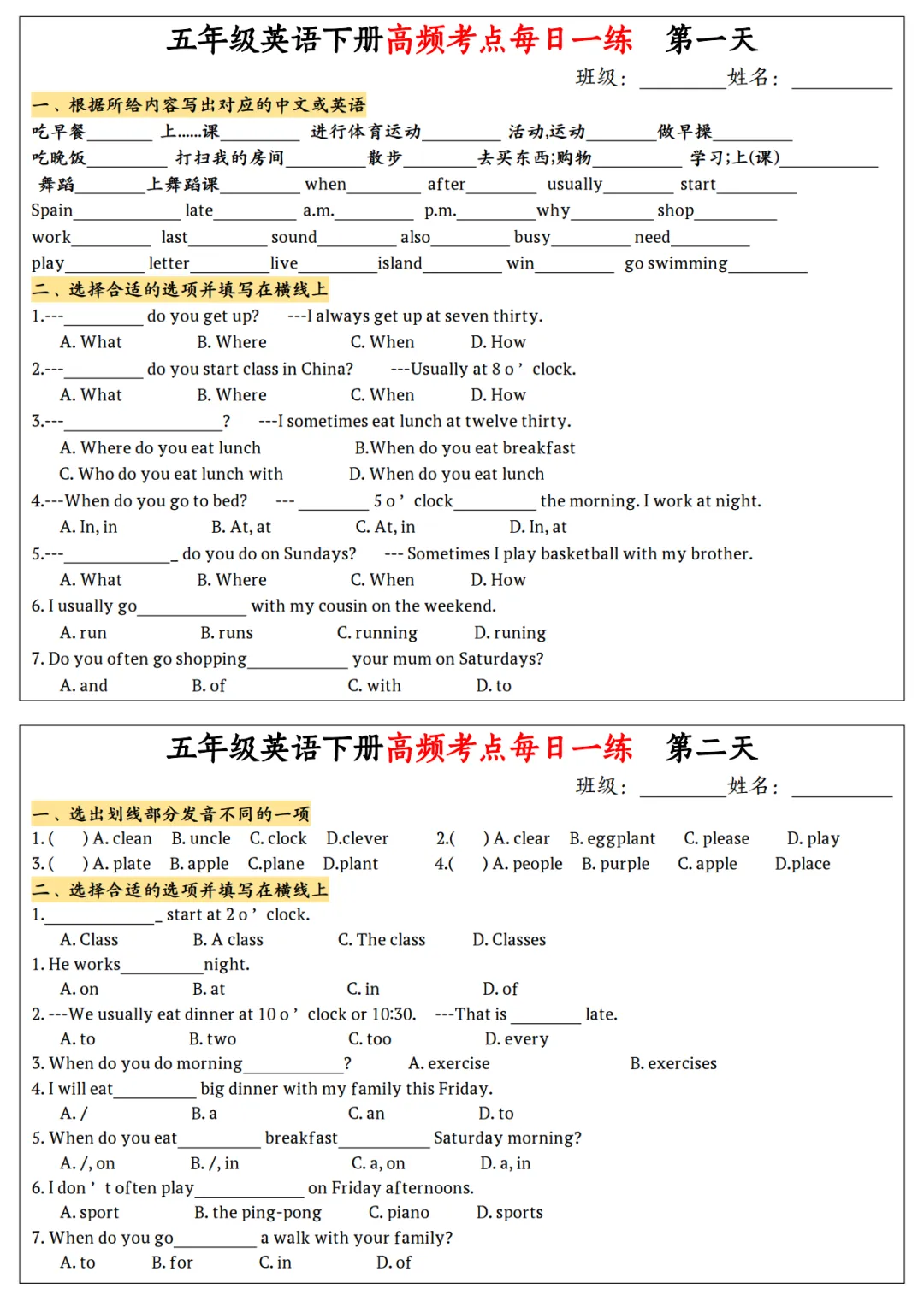 五年级有15天练习内容,含答案