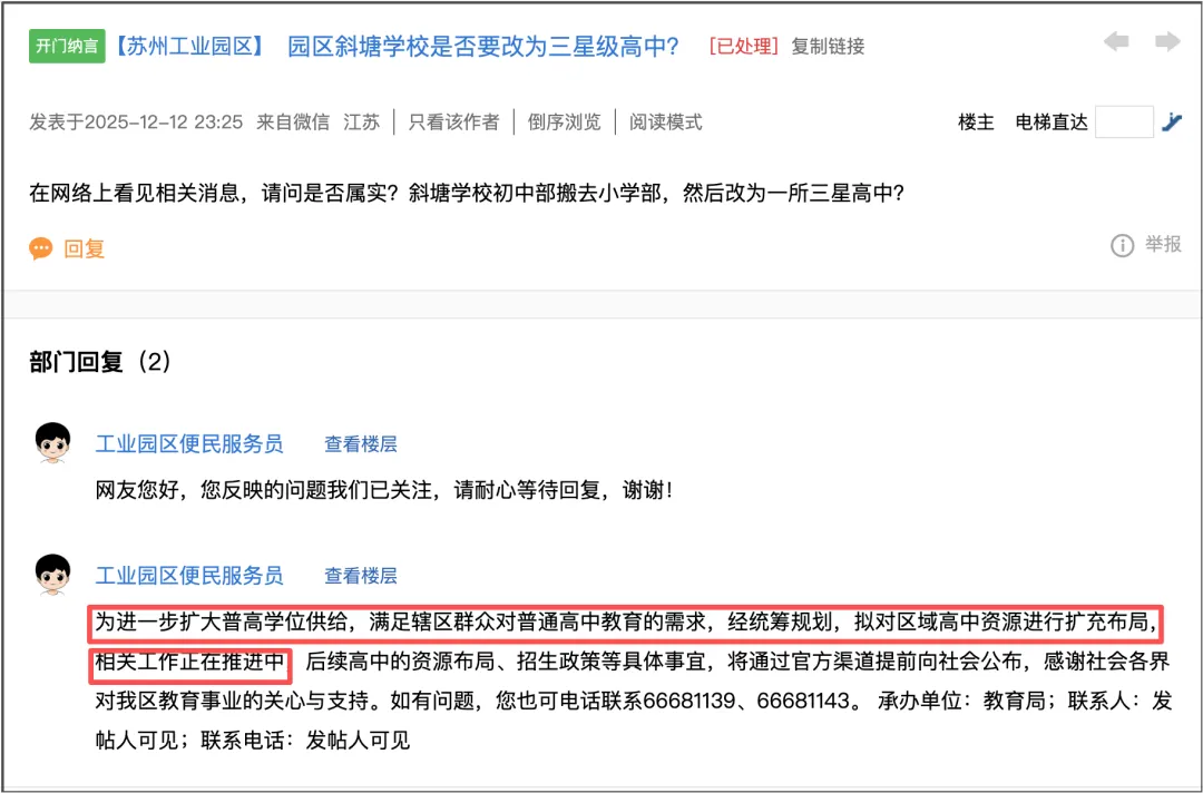 而在去年12月,寒山闻钟对此也做出了回复:为进一步扩大普高学位供给,满足辖区群众对普通高中教育的需求,经统筹规划,拟对区域高中资源进行扩充布局,相关工作正在推进中。似乎从侧面确认了这件事。