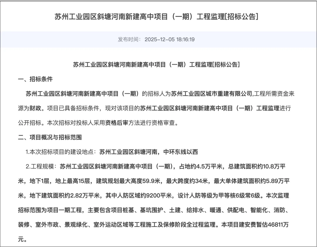 据了解,新校区拟选址于斜塘板块,靠近金鸡湖大道与星塘街交汇处,地处园区核心区域,计划在现有斜塘学校基础上进行调整升级,预计2026年投入使用,并启动首届高中一年级招生工作。