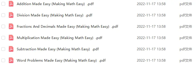 今天给大家分享一套原版数学思维教材Making Math Easy系列,共六册,以非常形象生动的方式,对小学数学基础知识点进行全面梳理,涉及了数学启蒙的各个方面,堪称数学基础宝典。教材以插图结合文字的形式介绍加减乘除等基本内容,知识点简洁明了,适合有英文水平的孩子自学或者懂英语的家长作为辅导材料。Addition Made Easy 《轻松学加法》Substraction Made Easy 《轻松学减法》Multiplication Made Easy 《轻松学乘法》Division Made Easy 《轻松学除法》Fractions and Demicals Made Easy 《轻松学分数、小数》Word Problems Made Easy 《轻松学应用题》这套教材专题词汇配解题过程,英文描述,每个主题不到50页,但相关的基础知识几乎全覆盖了!最后是轻松学应用题,这册还是一套综合练习,将前面所讲的加减乘除、小数分数每个专题所涉及的应用题都分节来说。而且实用性非常强,让孩子学会各种解题的方法和步骤,比如画图、图表、清单......再针对各个主题,用实例来解析,加强应用。这套书以例题做示范,针对小学数学基础知识点,全面梳理和解析基础概念、解题步骤及策略,整个解析、解题过程清晰易懂,是一套难得的数学基础必备宝典!领取方式一: