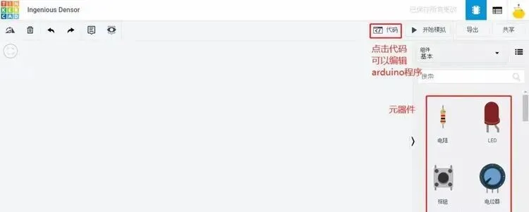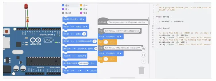 电路搭建界面,放个arduino板子就可以编辑代码,代码编辑可以选择块和文本方式,因能力而异。