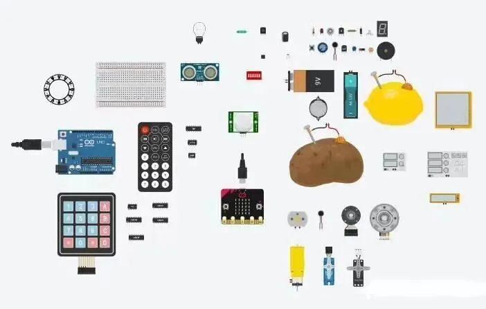 右边栏有我们常用的基础元器件:Arduino板、开关、电池、LED灯、二极管、三极管、示波器、可调电源等